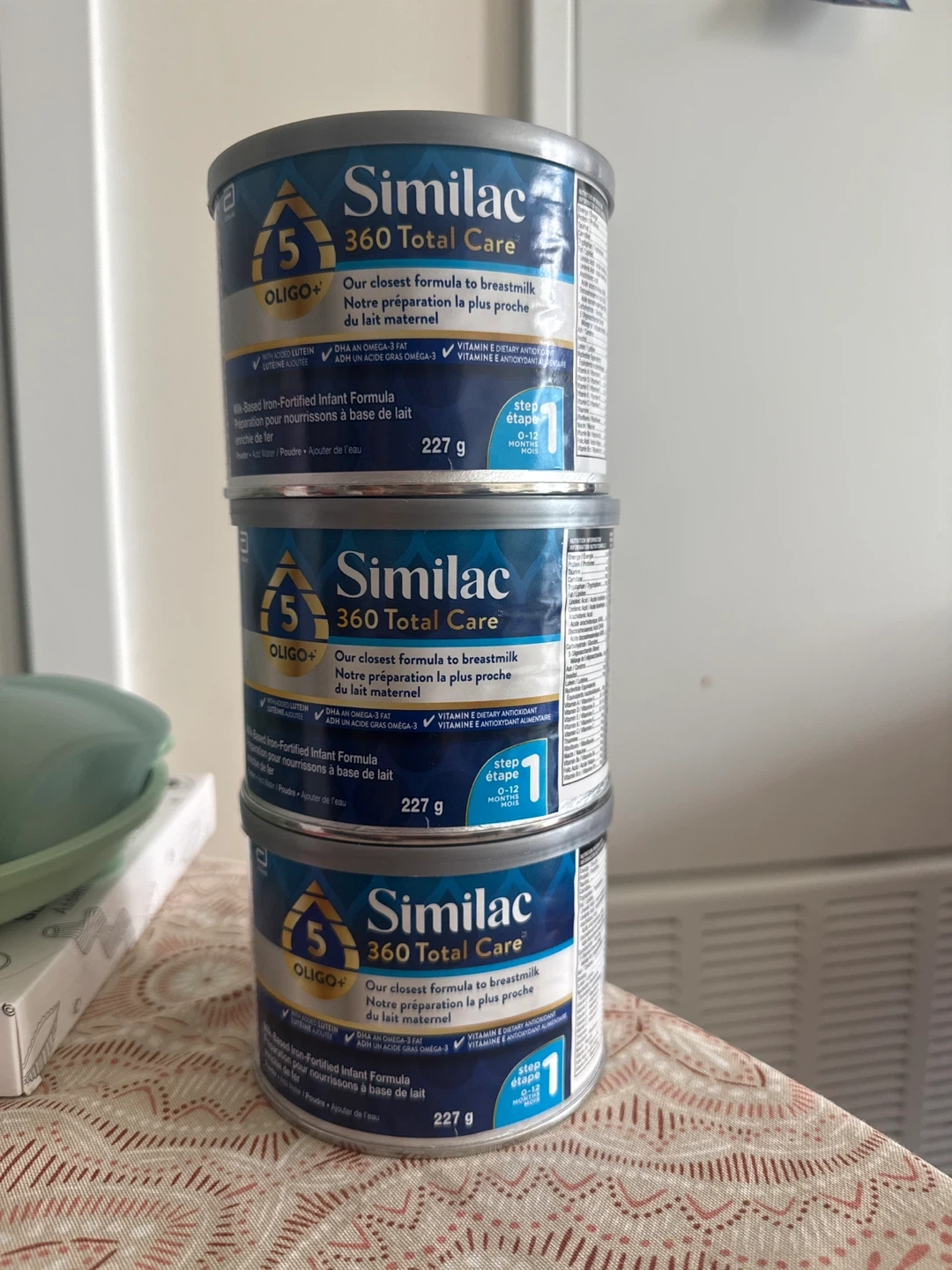 Three cans of Similac 360 Total Care infant formula. Each can is 227g. Formula is designed for infants 0-12 months. Expiry dates is feb 2027