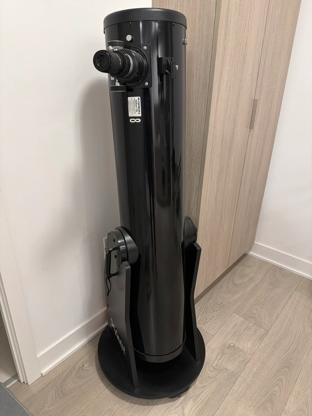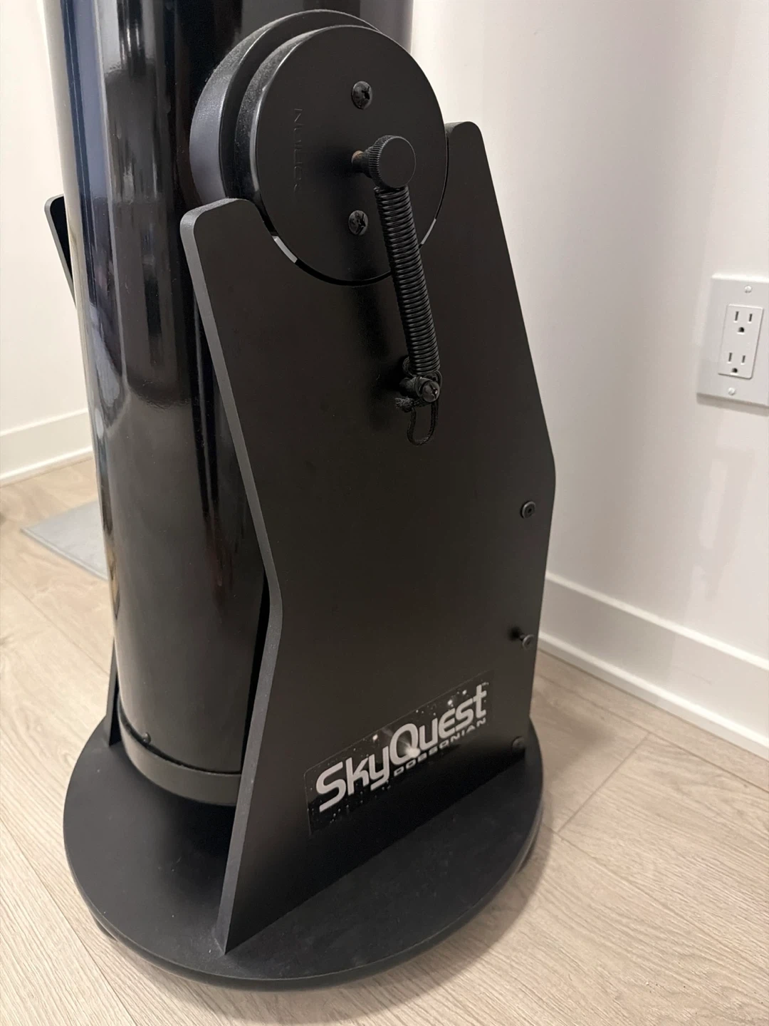 This is an Orion SkyQuest XT8 Dobsonian telescope. It's black with an 8-inch aperture. Great for viewing celestial objects!