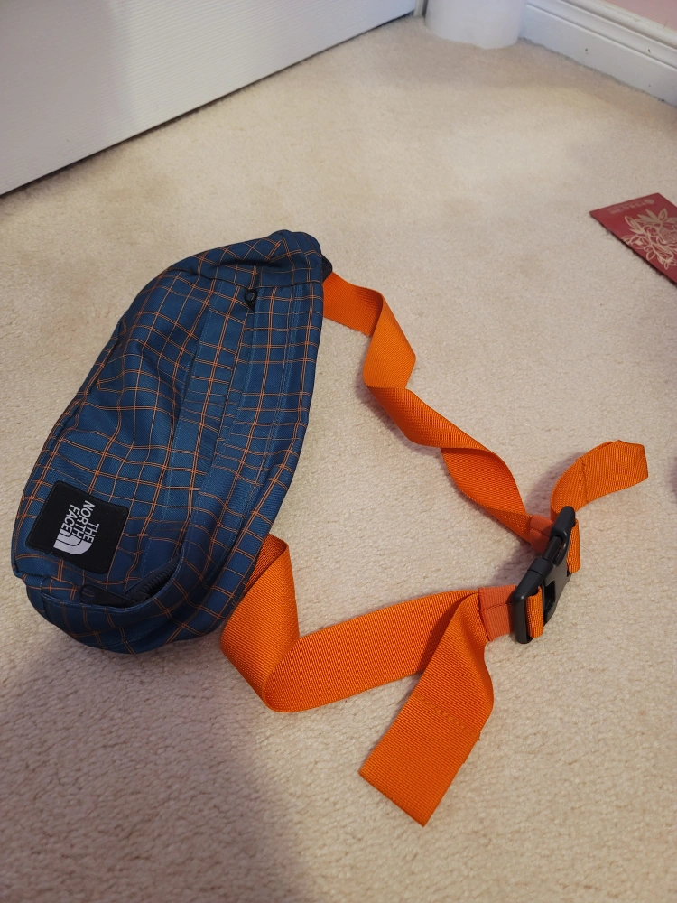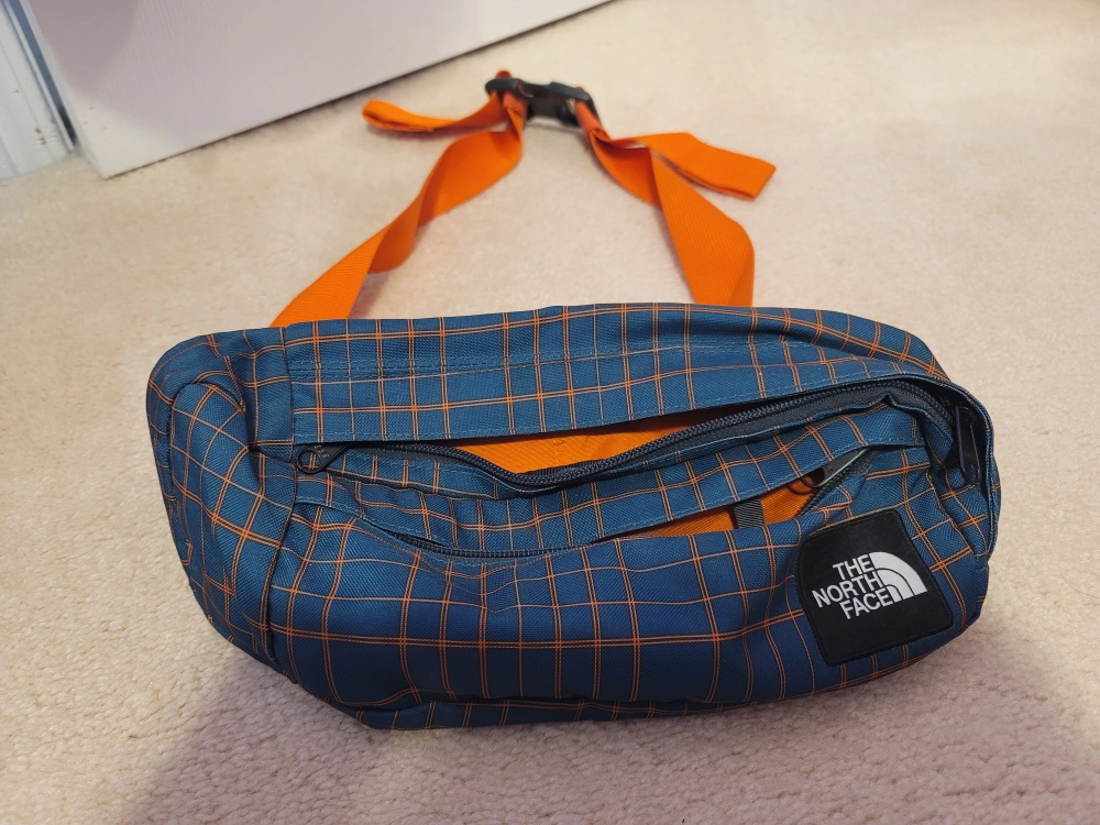 A The North Face fanny pack with a blue checkered pattern. Features an orange strap with buckle. Perfect for carrying your essentials on a leisurely stroll. Good for biking in summer