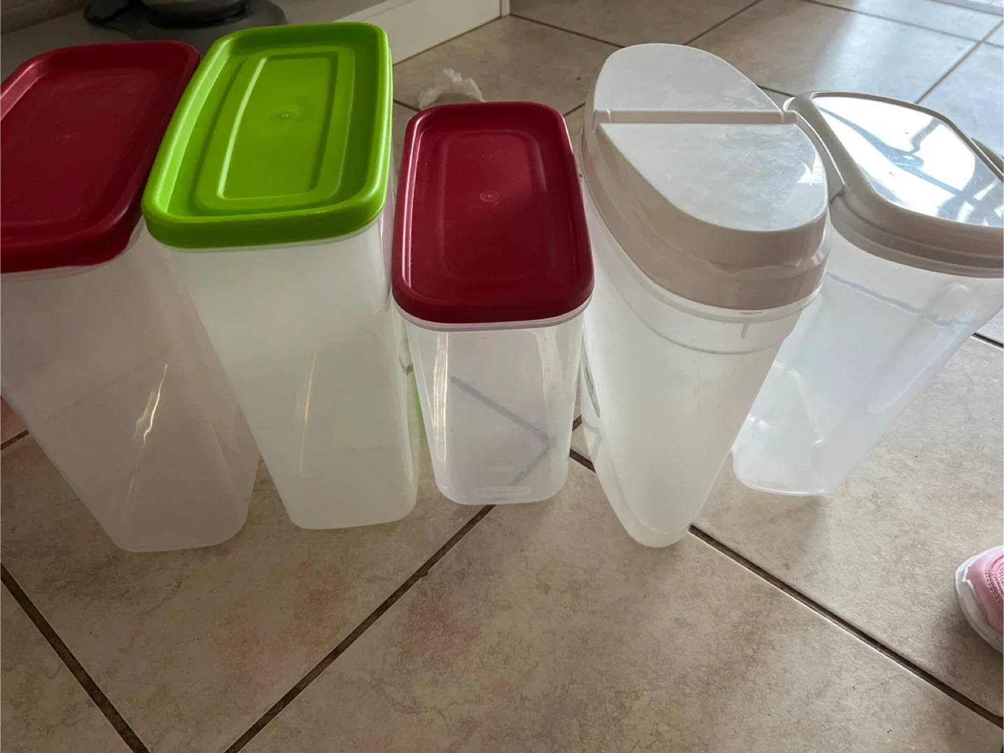 4 Big Plastic storage containers - 2 rubber maid , plastico. 2nd one from the right isnt available. one is new(green lid). strong and srurdy.
