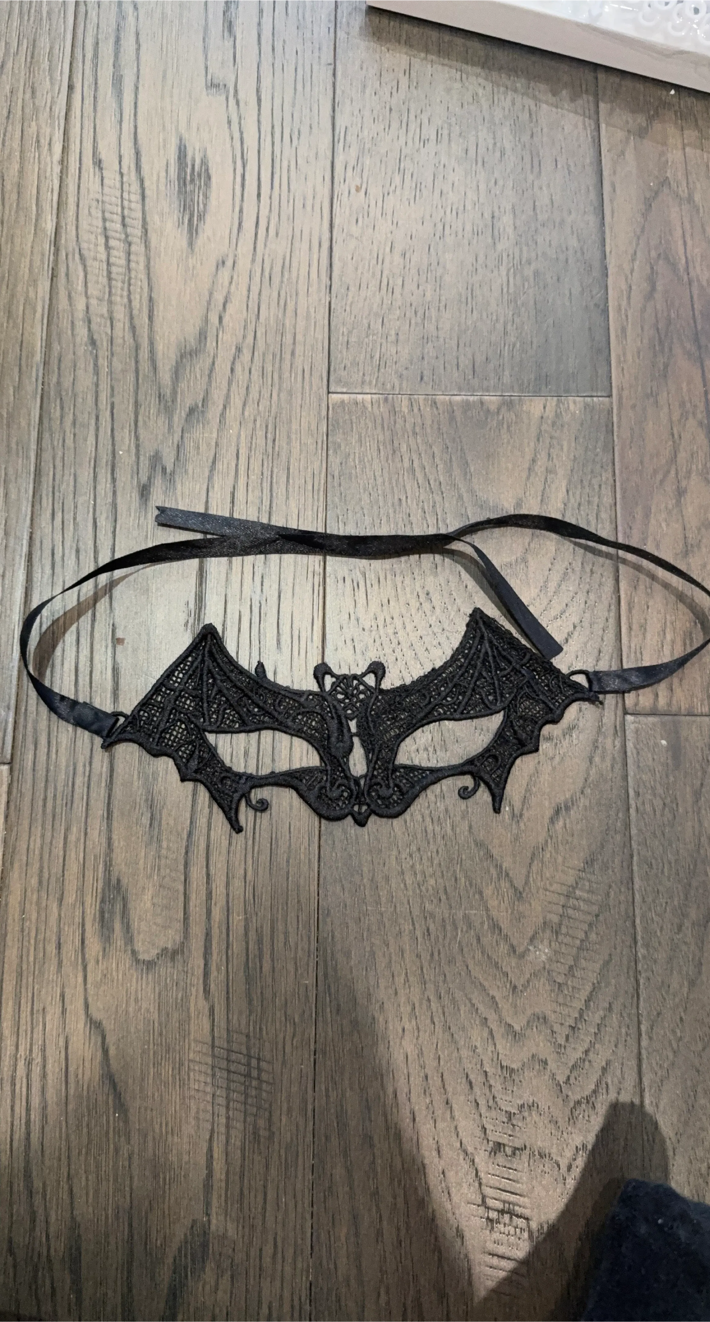 This black lace mask features a bat design with intricate detailing. It includes thin black ribbons for securing it in place. The lace material offers a delicate and stylish look. Cash and pick up.