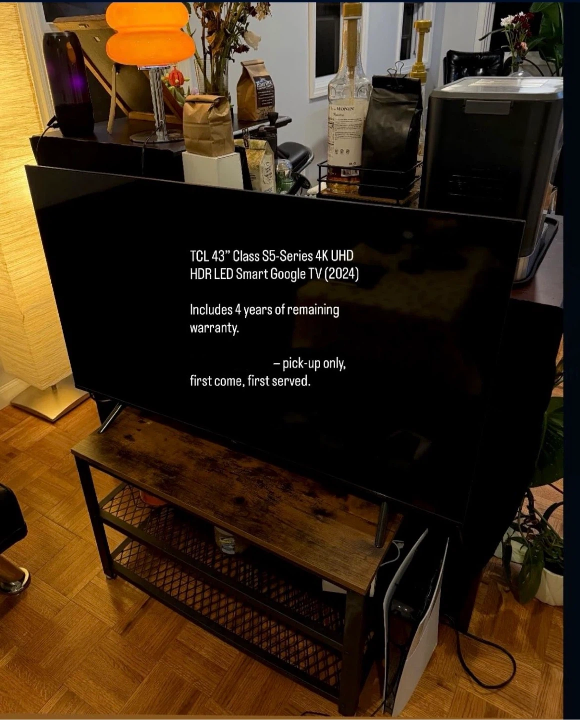 TCL 43" S5-Series 4K UHD HDR LED Smart Google TV. Includes 4 years of remaining warranty! This TV is perfect for a smart home setup. Pick-up only, first come, first served.