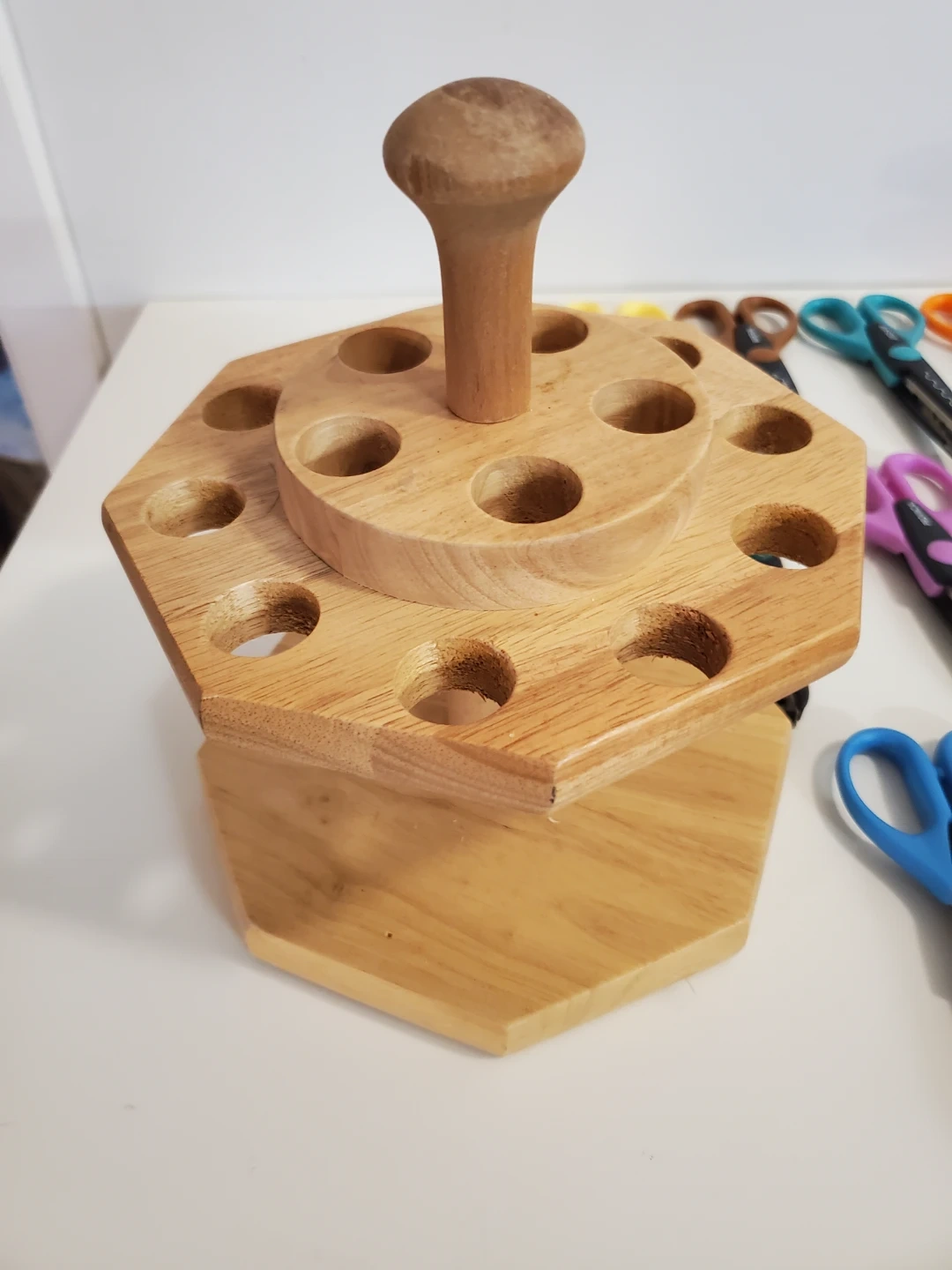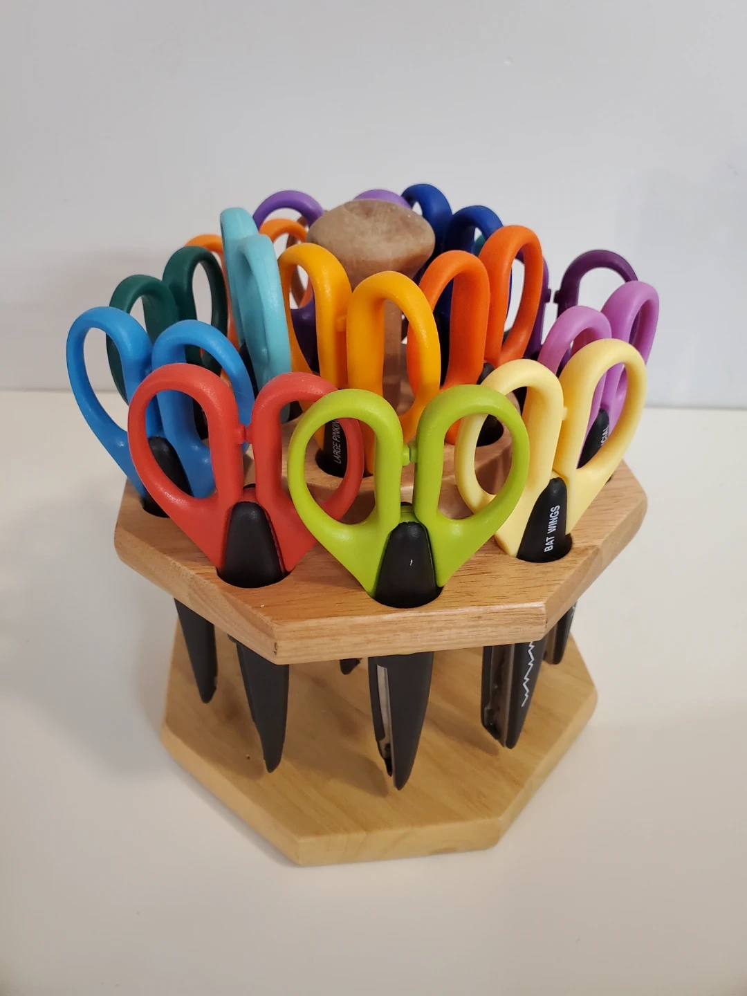 The rotating wooden stand keeps the scissors organized and within easy reach.Â