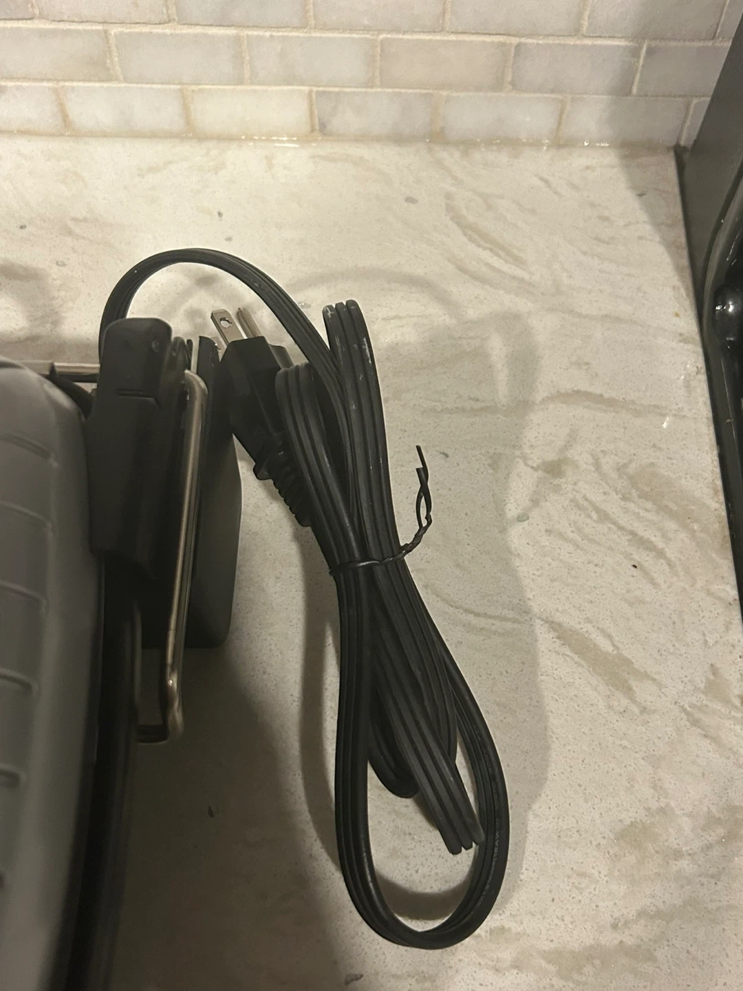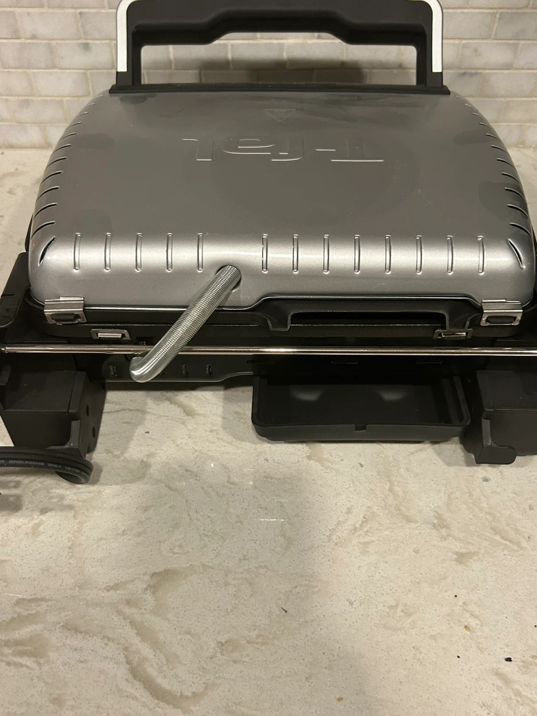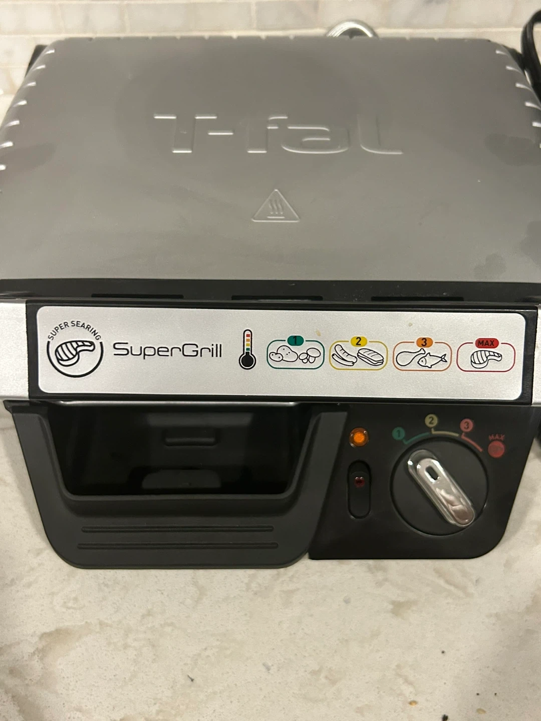 It's a T-fal SuperGrill indoor grill with super searing capability. Features adjustable temperature control from 1 to 3, with a Max setting. Includes a removable drip tray for grease collection. Only used once.