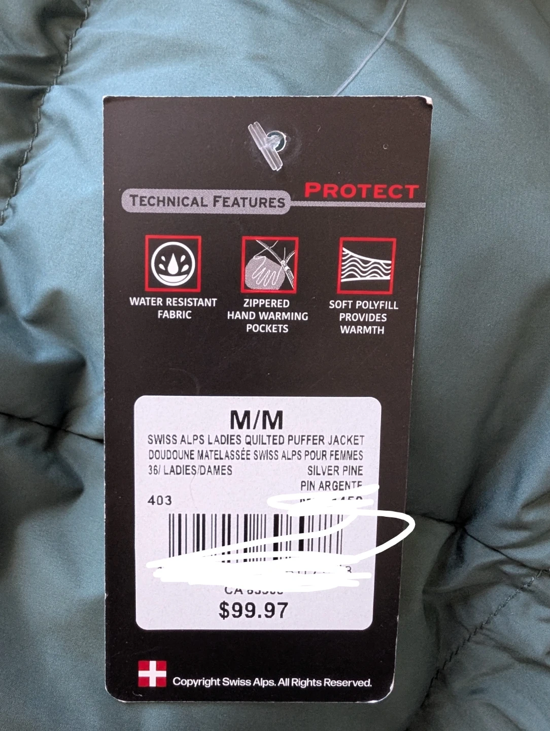 Came smaller than expected. New. Swiss Alps Ladies Quilted Puffer Jacket. Water resistant fabric, zippered hand warming pockets and soft polyfill for warmth. Size M/M.