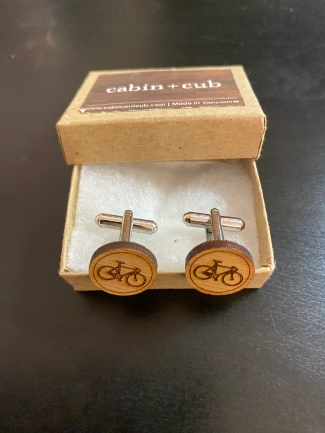 224Here's a pair of Cabin + Cub cufflinks, handmade in Vancouver! They feature a bicycle design on a round, wooden base. Comes with the original box. Perfect for people who love creative designs.