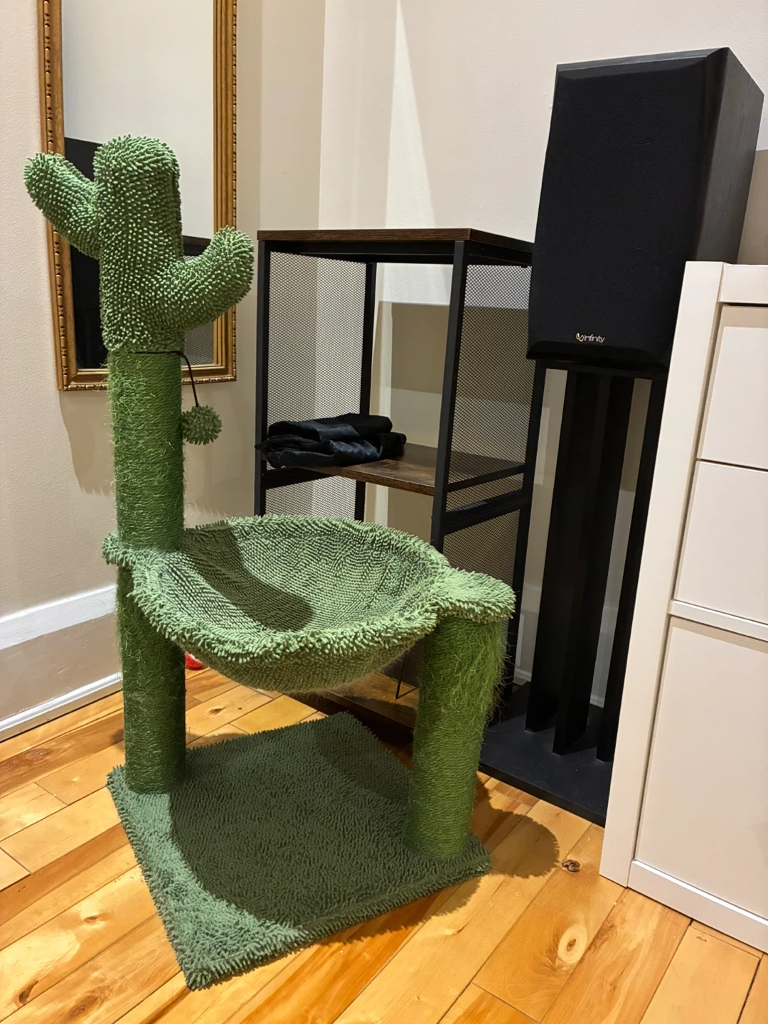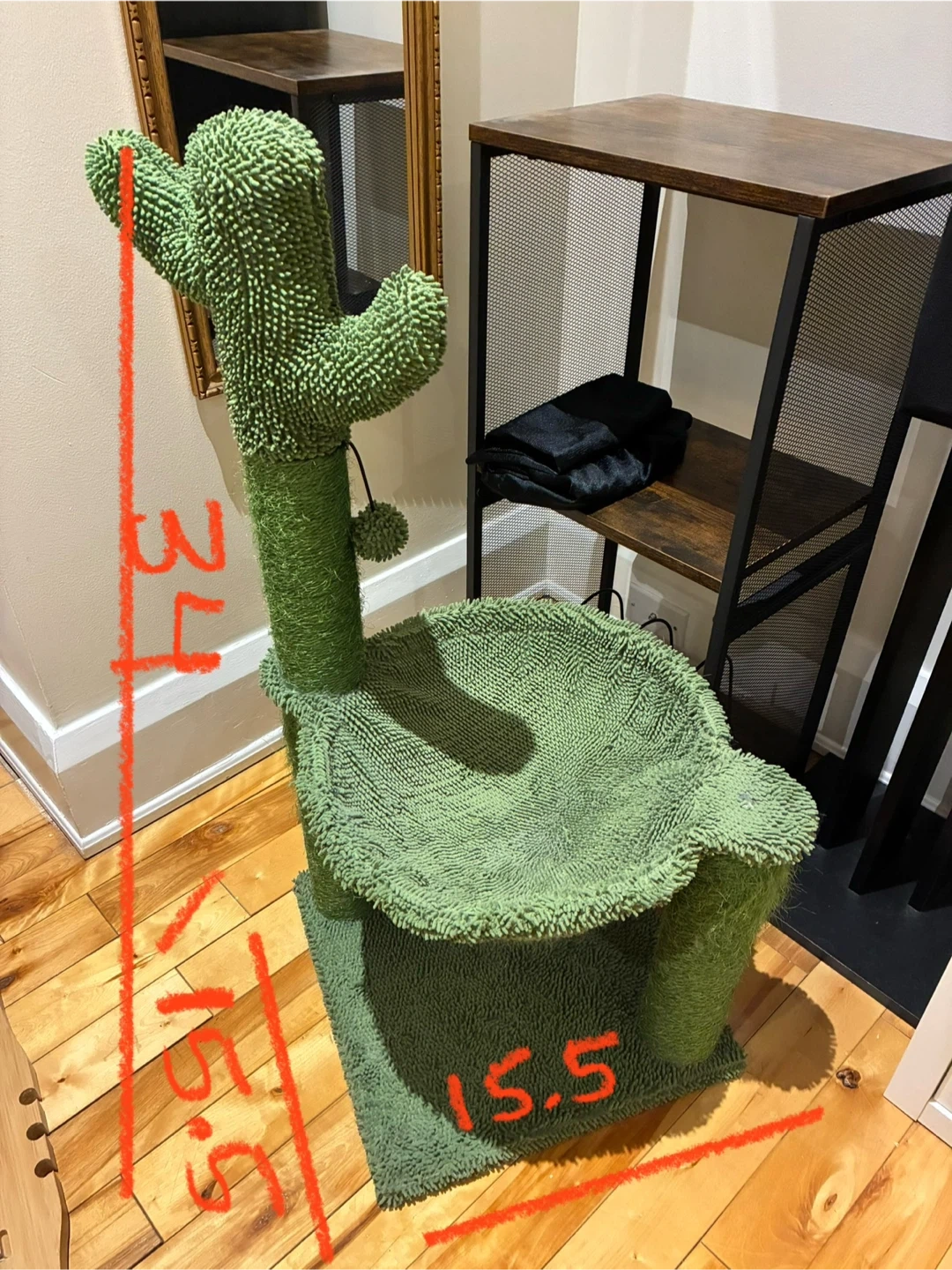 104Cute cactus-shaped cat tree in great condition! It's a fun and cozy spot for your cat to relax and play. The dimensions are approximately 34 inches tall and 15.5 inches wide. Pickup Bay and Dundas