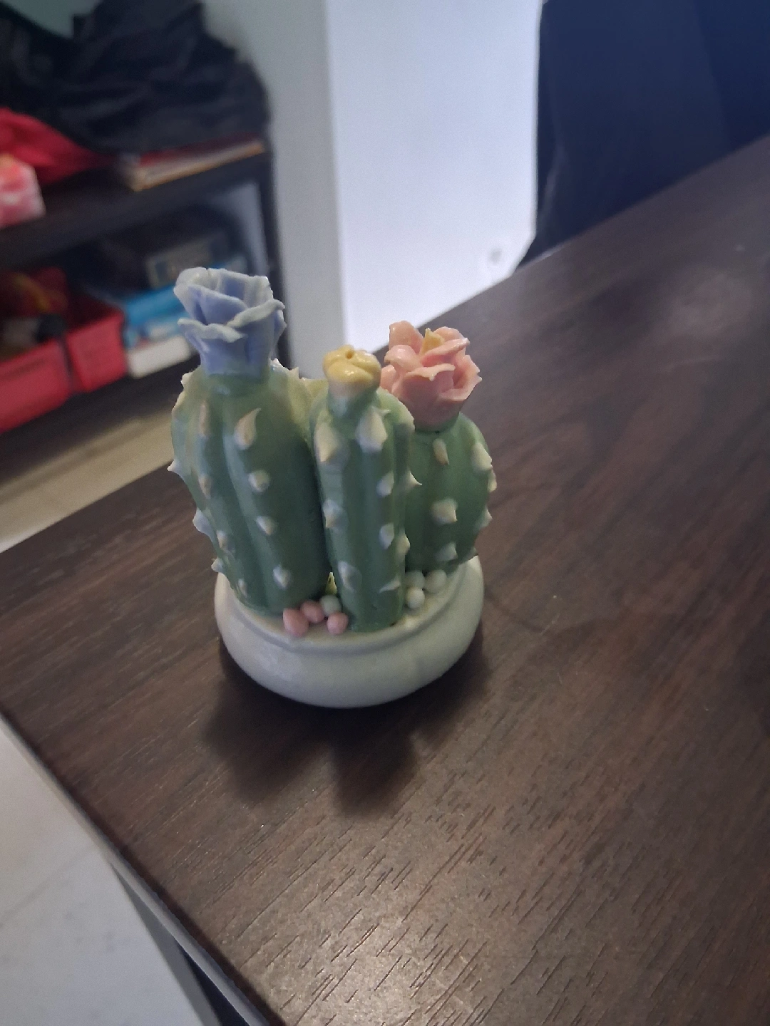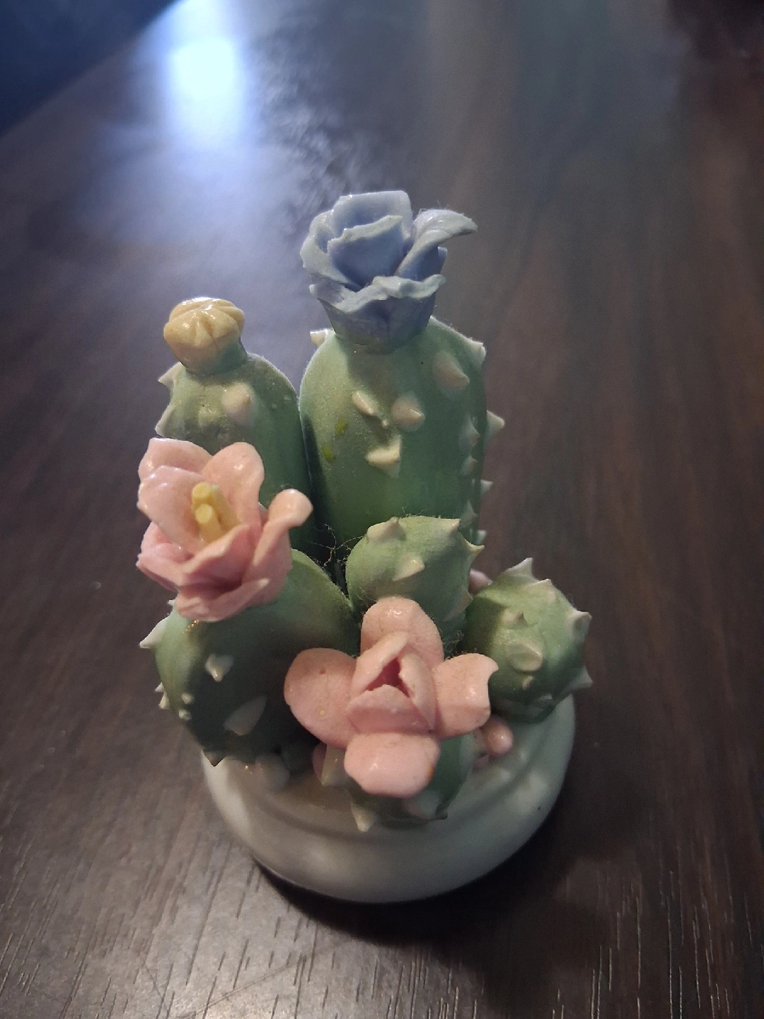 353Cute ceramic cactus figurine with pastel flowers! It's in great shape and would look lovely on a shelf or desk. Perfect for adding a touch of whimsy to any room