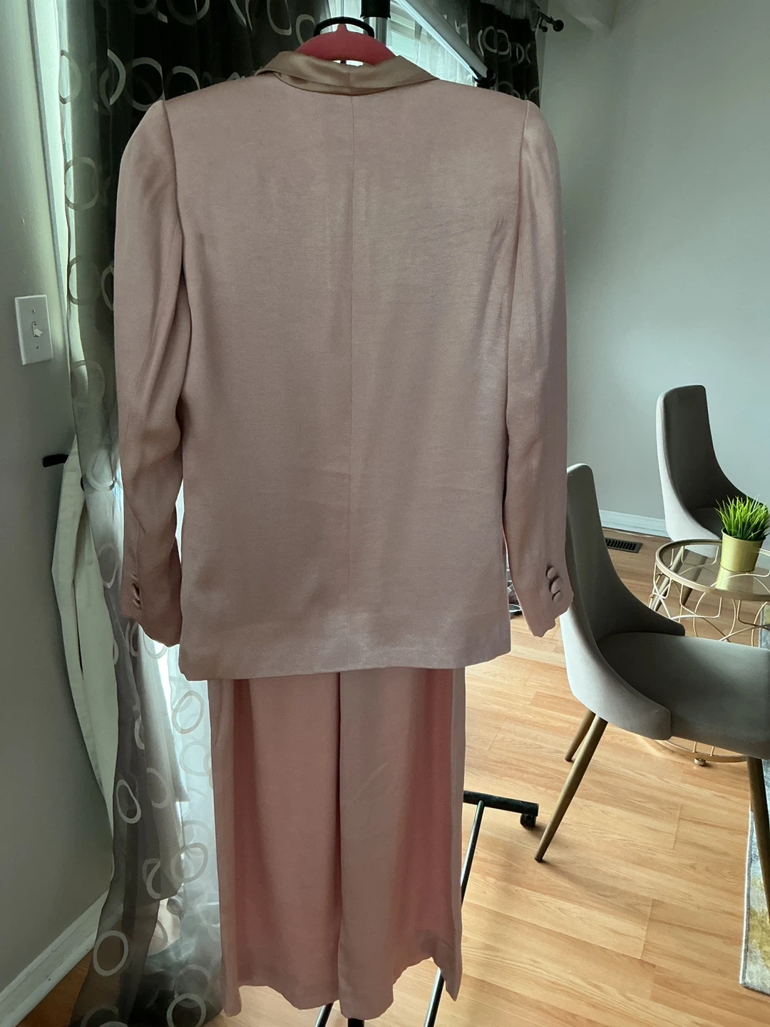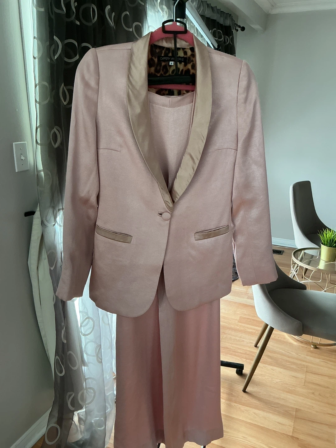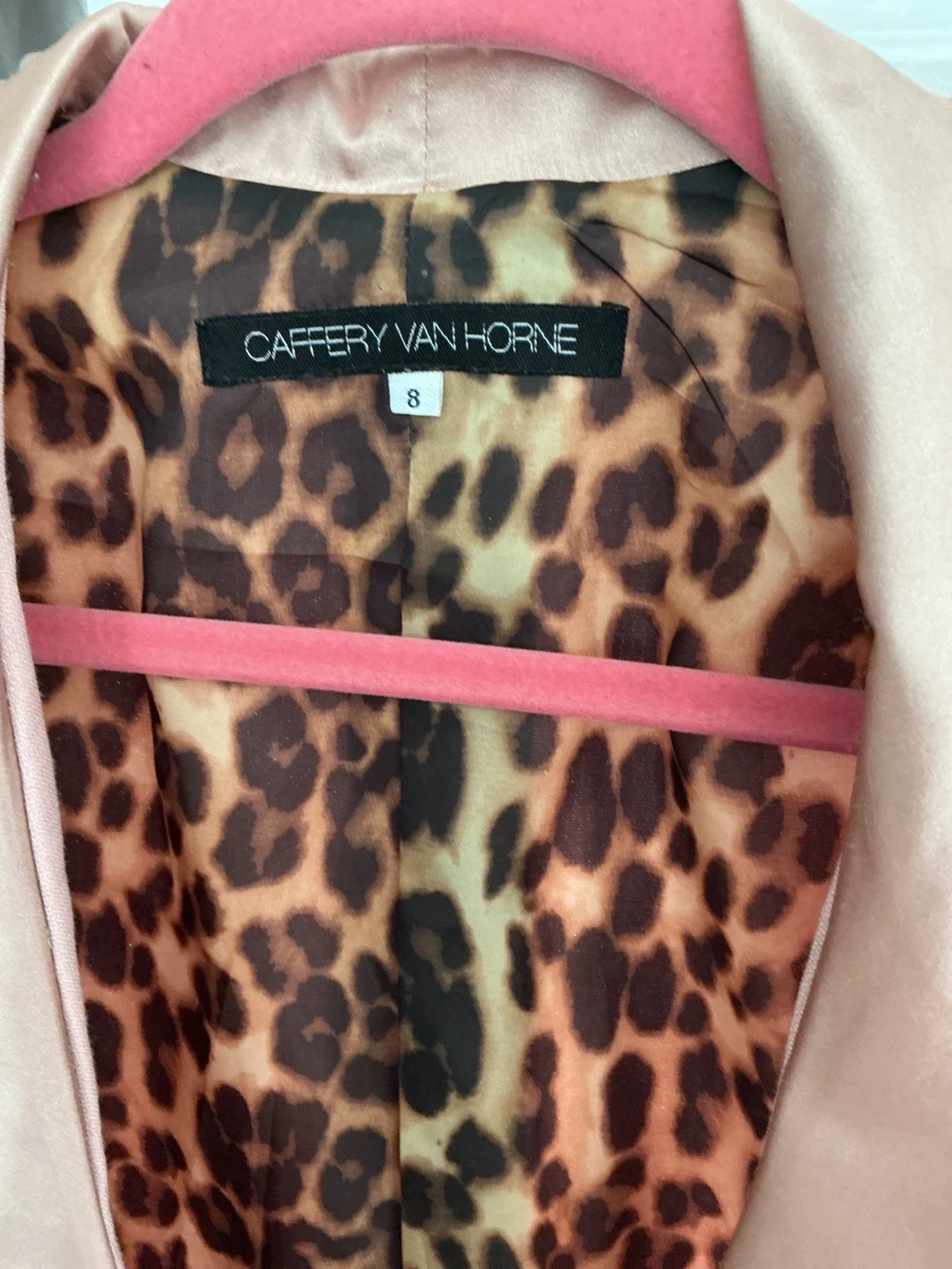 32A sophisticated, statement-making designer set from Caffery Vanhorne — tailored, elegant, and beautifully made. This two-piece features a luxe satin-trim tuxedo jacket paired with effortless wide-leg flow pants for a polished, feminine silhouette. 💗 Features: • Pink Tuxedo Jacket (Size 8) •Satin shawl lapel + satin pocket trim •Soft structured shoulders •Single-button closure •Bold leopard-print lining — Caffery’s signature touch •Perfect for evening wear, events, or elevated work looks • Matching Pink Wide-Leg Pants •High-waist, fluid drape •Hidden side zipper with covered button •Clean, elegant lines •Comfortable & classy ✨ Condition: Good, gently worn, no flaws. 💫 Styling Notes: Wear as a full power-suit moment, or pair the jacket with jeans, trousers, or a slip dress. The pants are perfect with silk camis, bodysuits, or a white blouse. 💰 Selling Options: •Buy the full set, or •Purchase the jacket or pants individually.