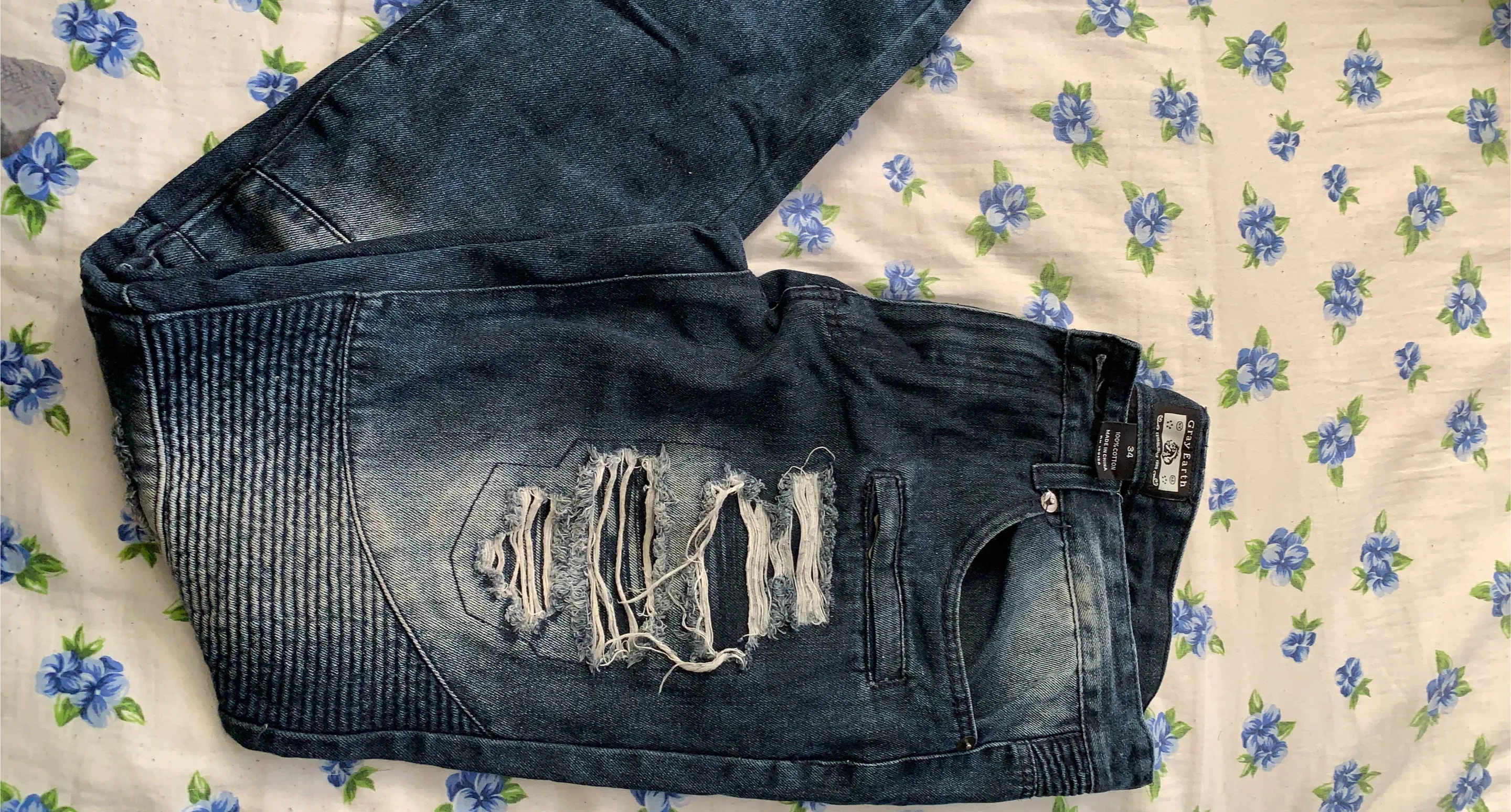 Gray Earth men's denim jeans with distressed detailing and moto-style ribbed panels. Made from 100% cotton for comfort. Size 34.