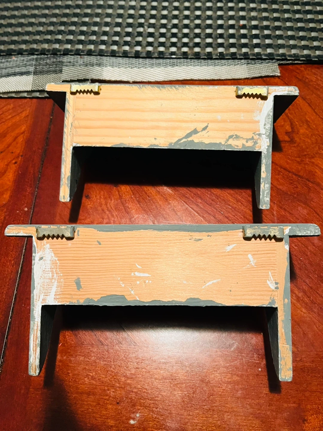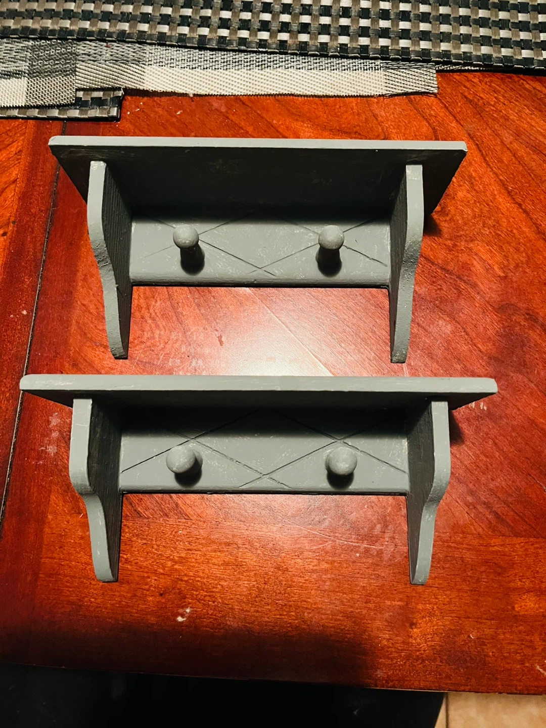 Decorative wooden shelves to hang on the wall. Can easily be repainted. Take both for $5 CAD firm. Measurements in pictures. Smoke Free Home.