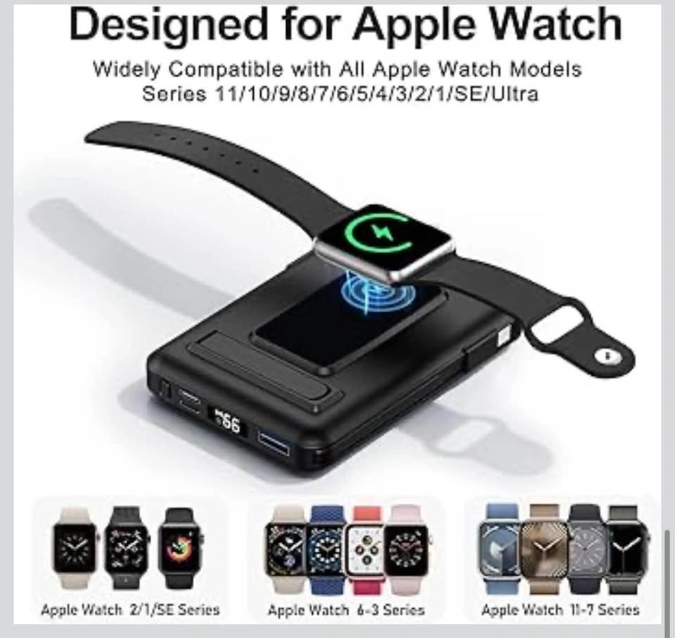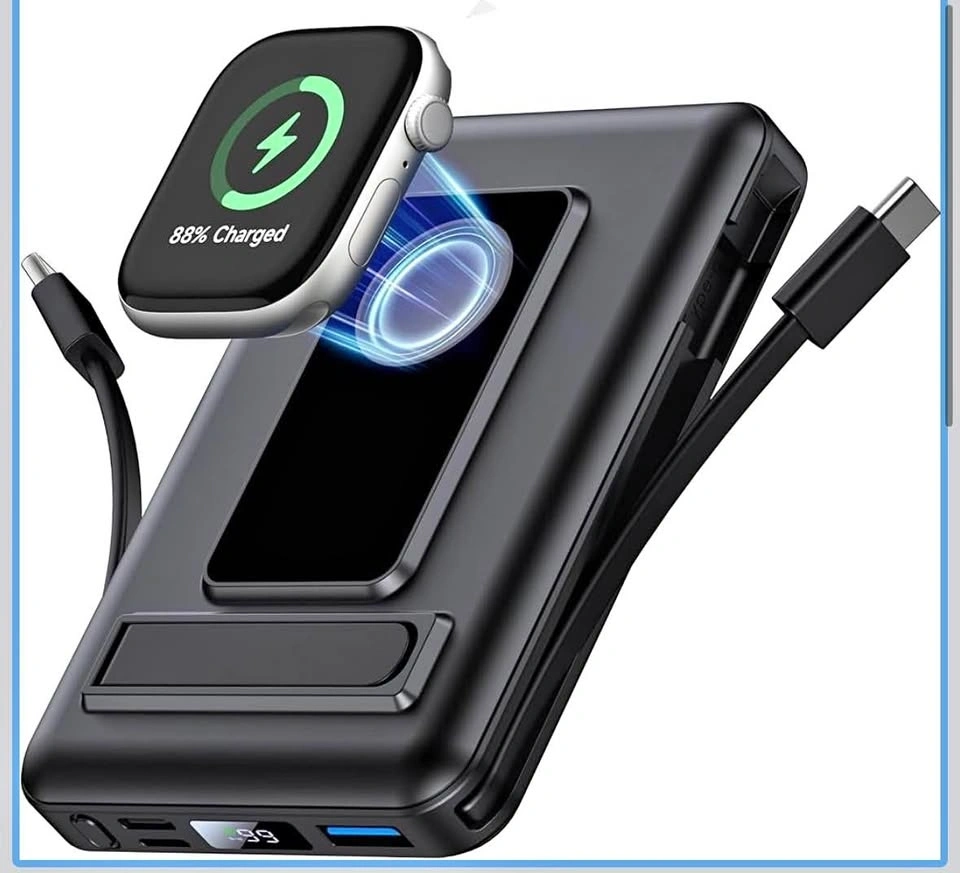 High-capacity 10000mAh wireless portable charger that can charge 6 devices simultaneously. Has USB-A and USB-C outputs and a built-in cable. Compatible with Apple Watch models. Can charge devices like smartphones, tablets, and earbuds. Has a digital display showing battery level.