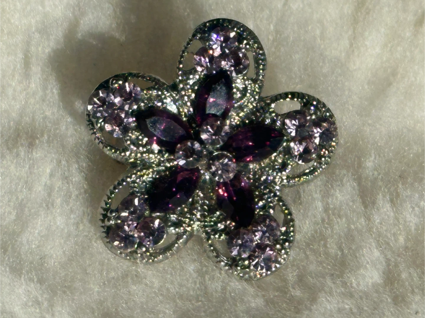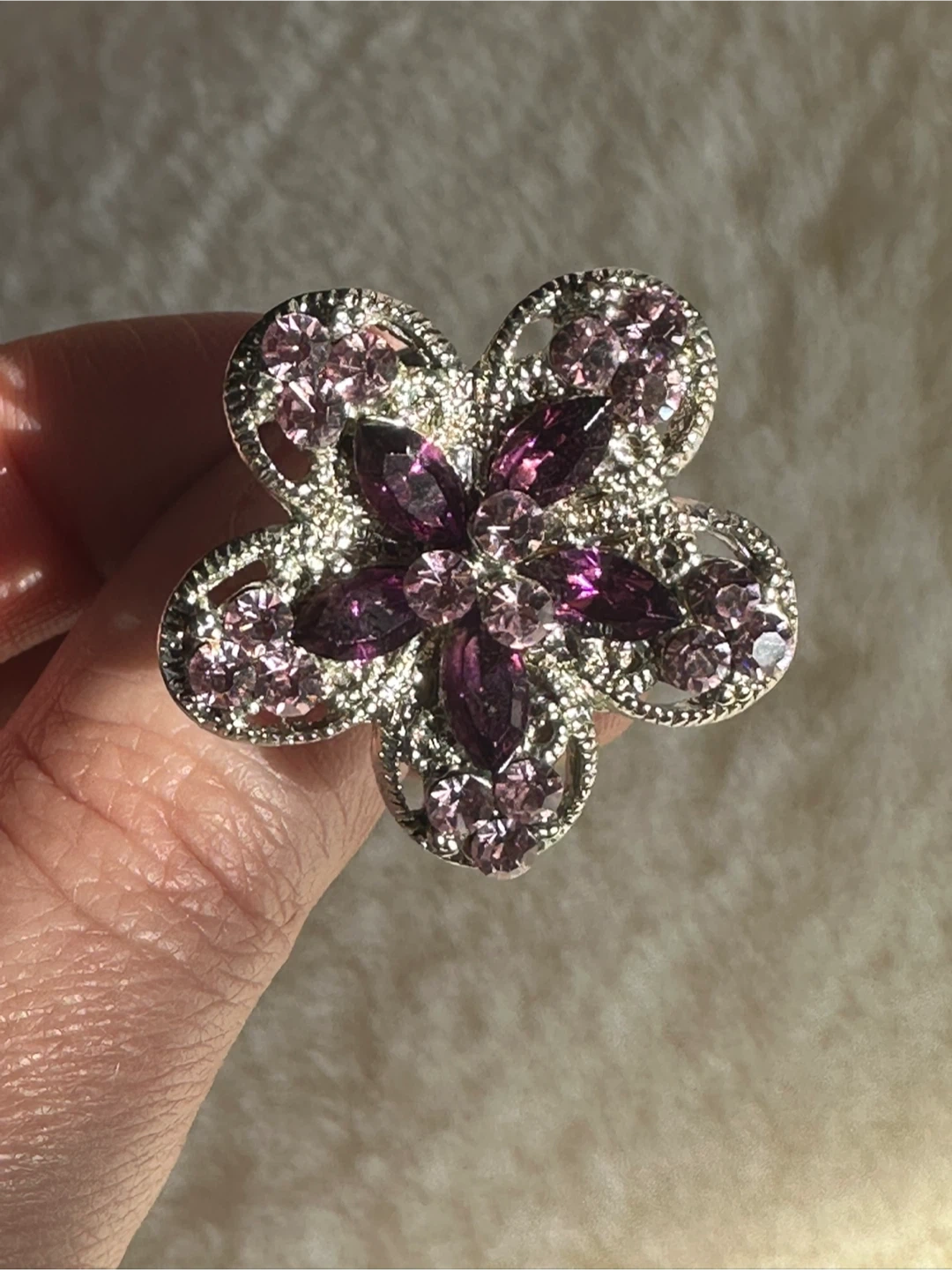 This statement ring features a delicate flower design with sparkling purple and pink crystals.