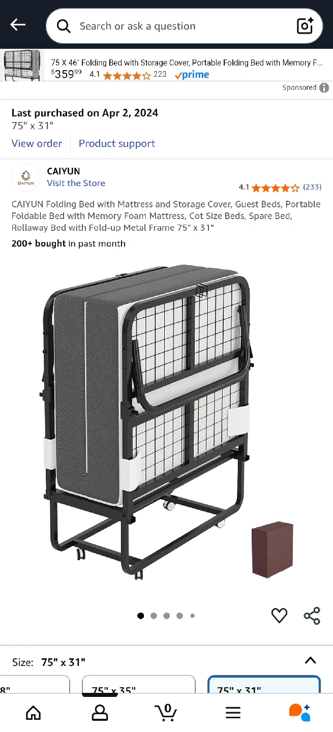 10Looking to free up some space? I'm selling a CAIYUN folding bed with mattress and storage cover! It's super handy for guests or small spaces. The bed measures 75" x 31" and comes with a foldable metal frame. It's easy to roll away and store when not in use