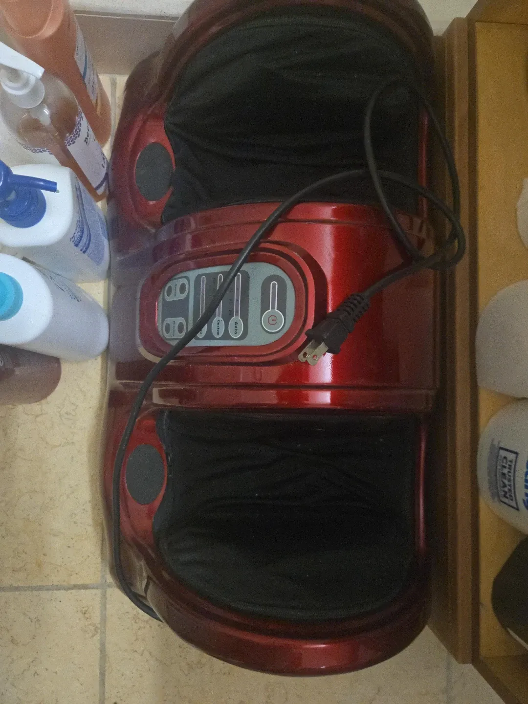 This red Shiatsu foot massager offers customizable massage experiences. It features an 'Auto' mode and a 'Custom' setting. The device includes an on/off power button for easy operation.