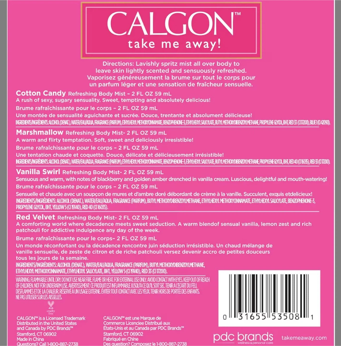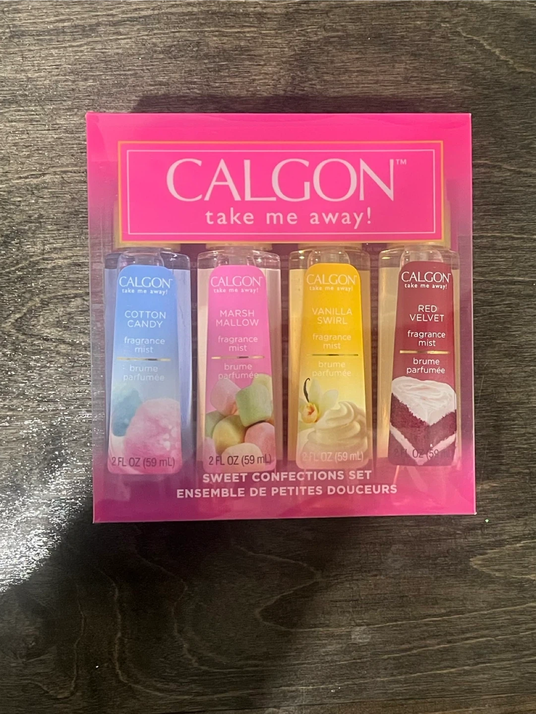 86Selling a Calgon Take Me Away! Sweet Confections set. It includes four 2 fl oz (59 mL) body mists in the scents Cotton Candy, Marshmallow, Vanilla Swirl, and Red Velvet. It has never been used and is in the original packaging