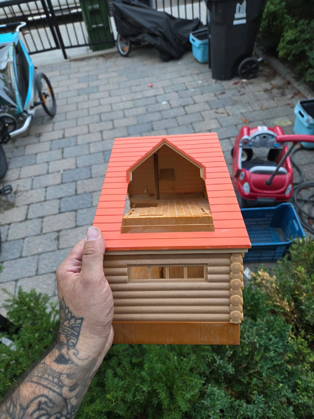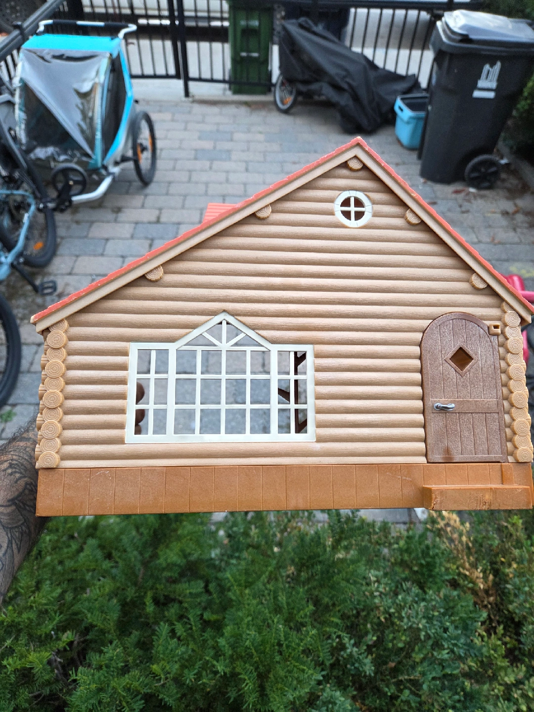 Calico Critters Lakeside Lodge The log cabin is a toy playset featuring a rustic design with a red roof, a large window, and a door. It is designed for use with Sylvanian Families or Calico Critters figures and accessories. The kids love the traditional doll house set up!! very good shape some missing hand rail I bellieve.