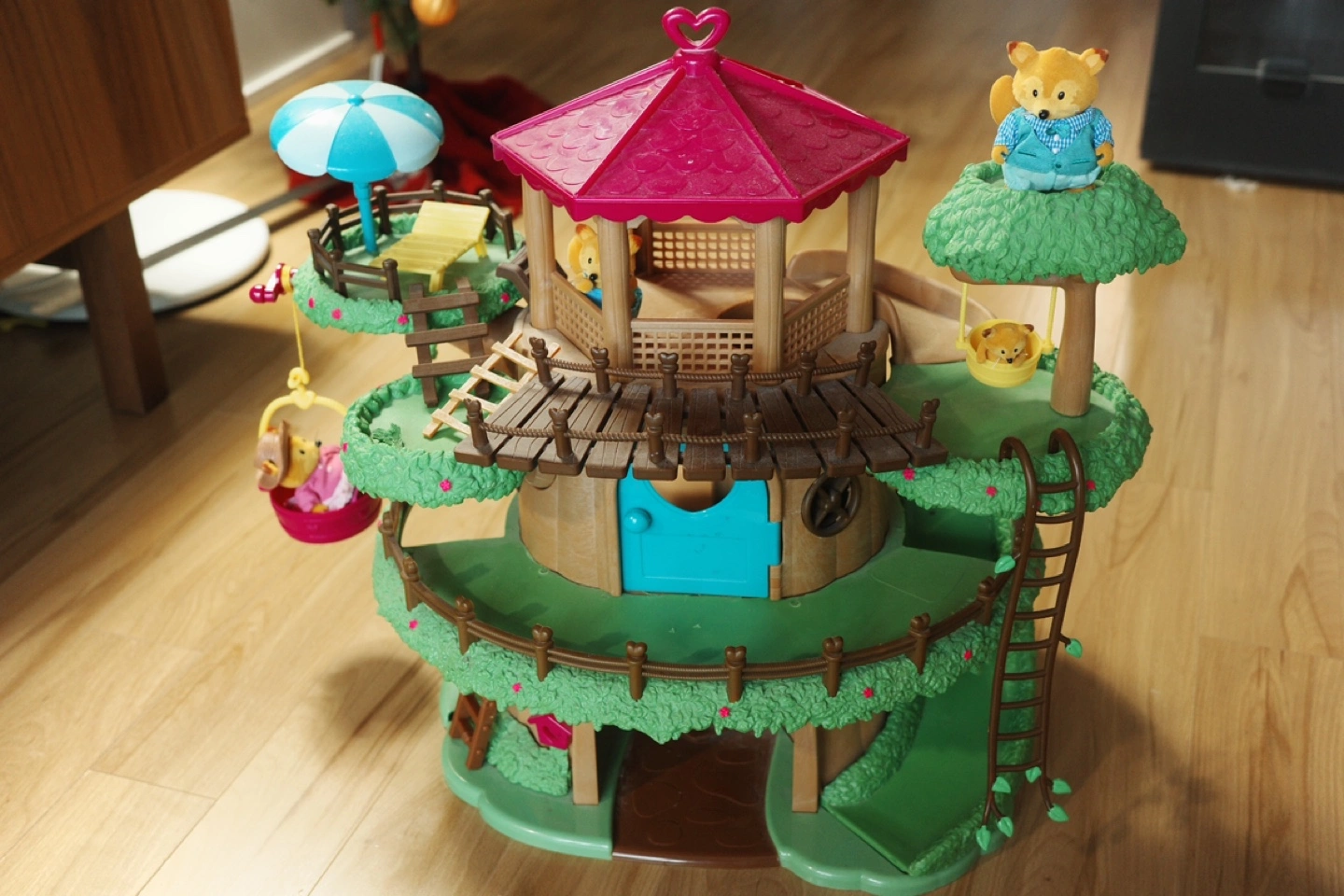 Adorable Calico Critters treetop house playset. Includes multiple levels, swings, and figures. Excellent condition. Perfect for imaginative play. Comes with fox family.