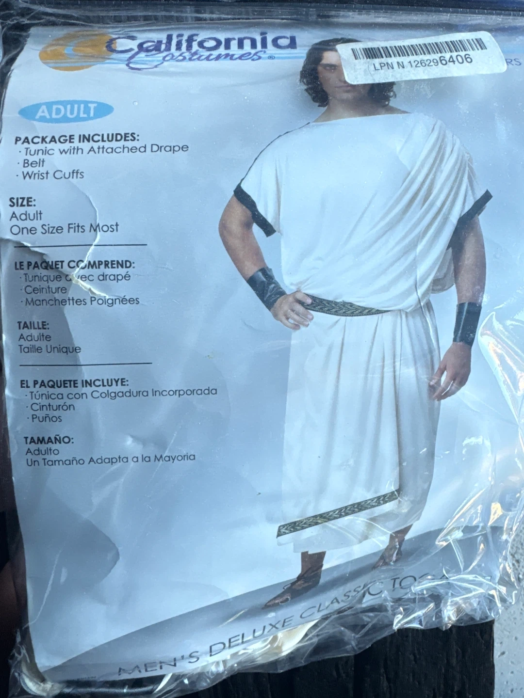 Selling a California Costumes Men's Deluxe Classic Toga. It's an adult size, one size fits most. Package includes: - Tunic with attached drape - Belt - Wrist cuffs