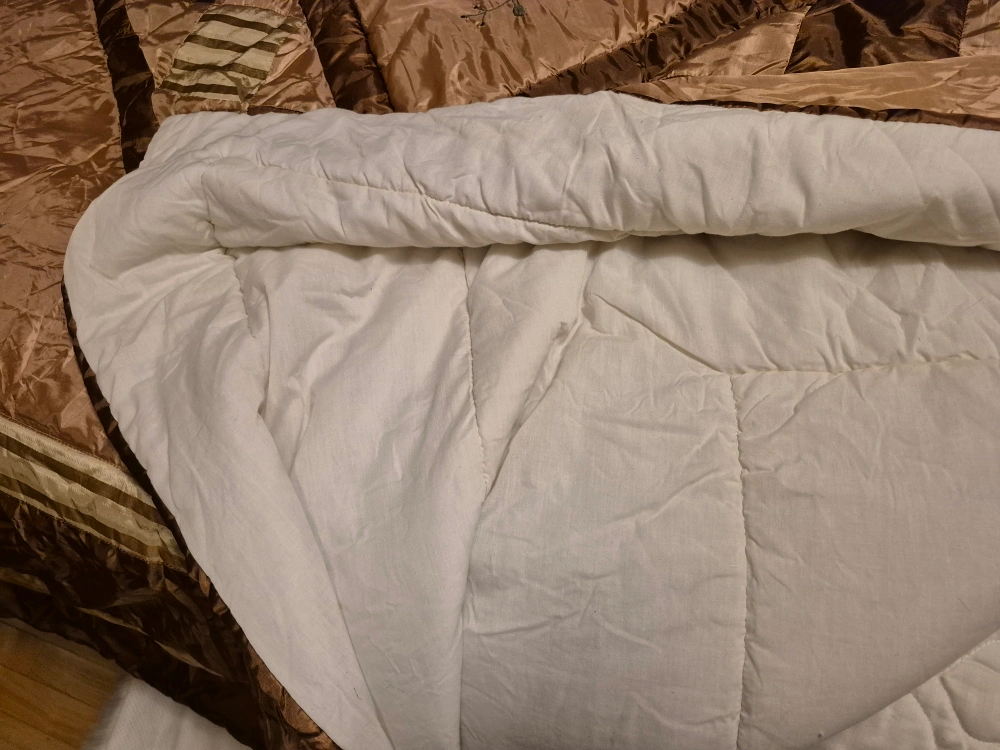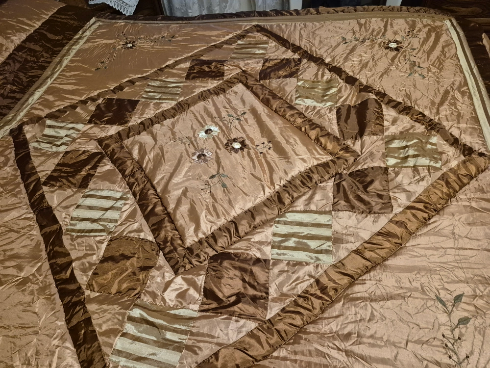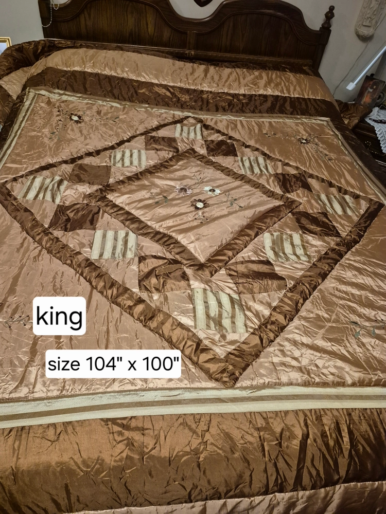 California King size comforter set, measuring 104" x 100". It features a unique geometric pattern in shades of brown and beige. Perfect for adding a touch of elegance to your bedroom! no tears or stains, smoke free home. porch pickup only Bathurst and dundas street area on Euclid avenue.