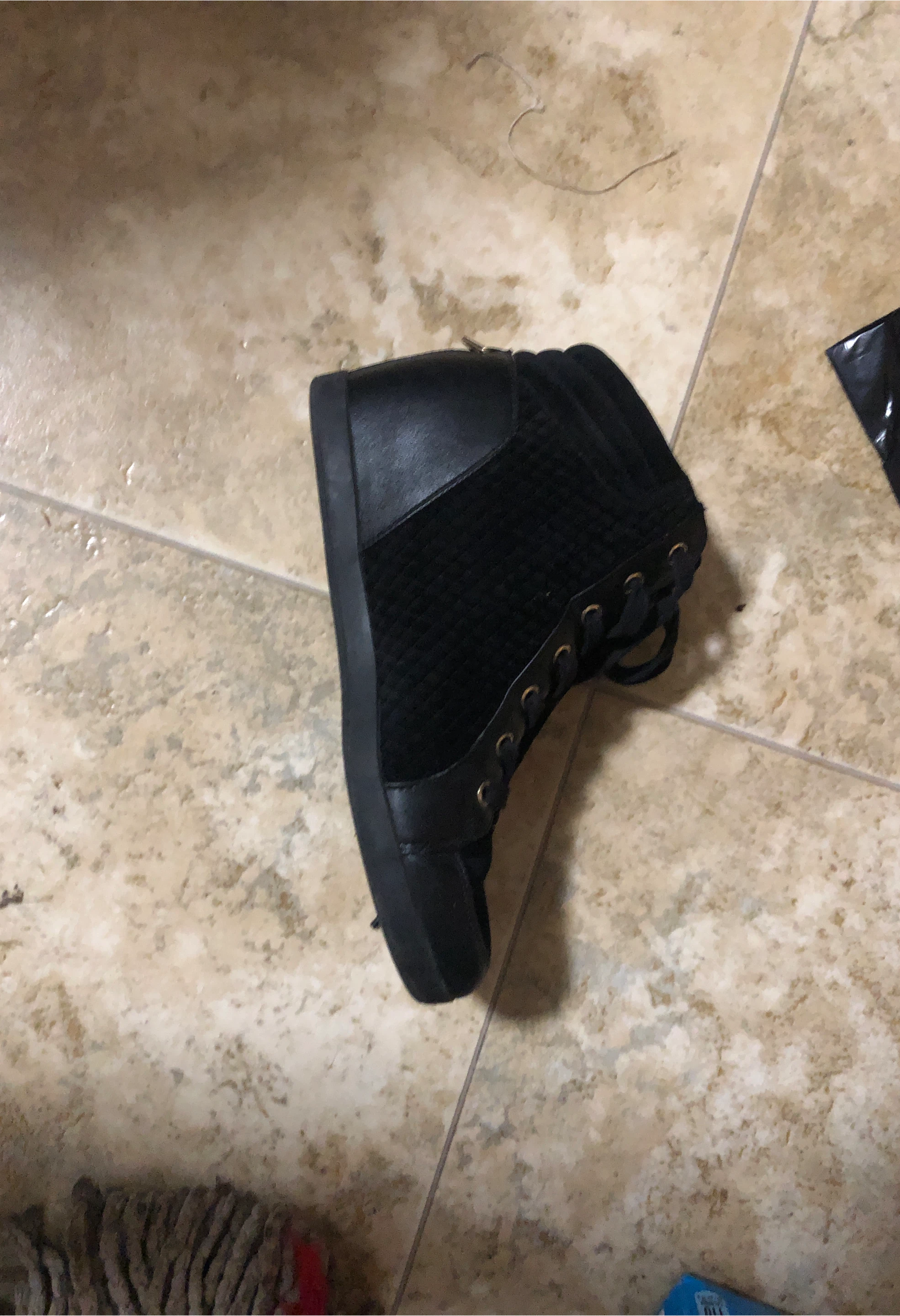 15Selling a black high-top sneaker. It appears to be in good condition and has a stylish design. Perfect for casual wear!