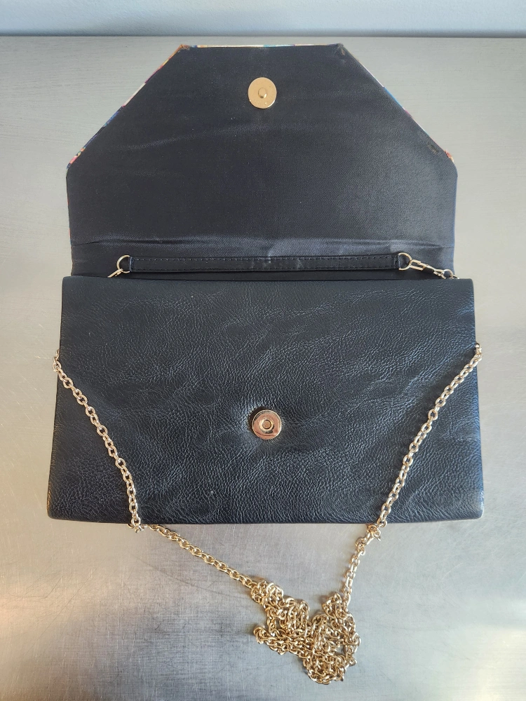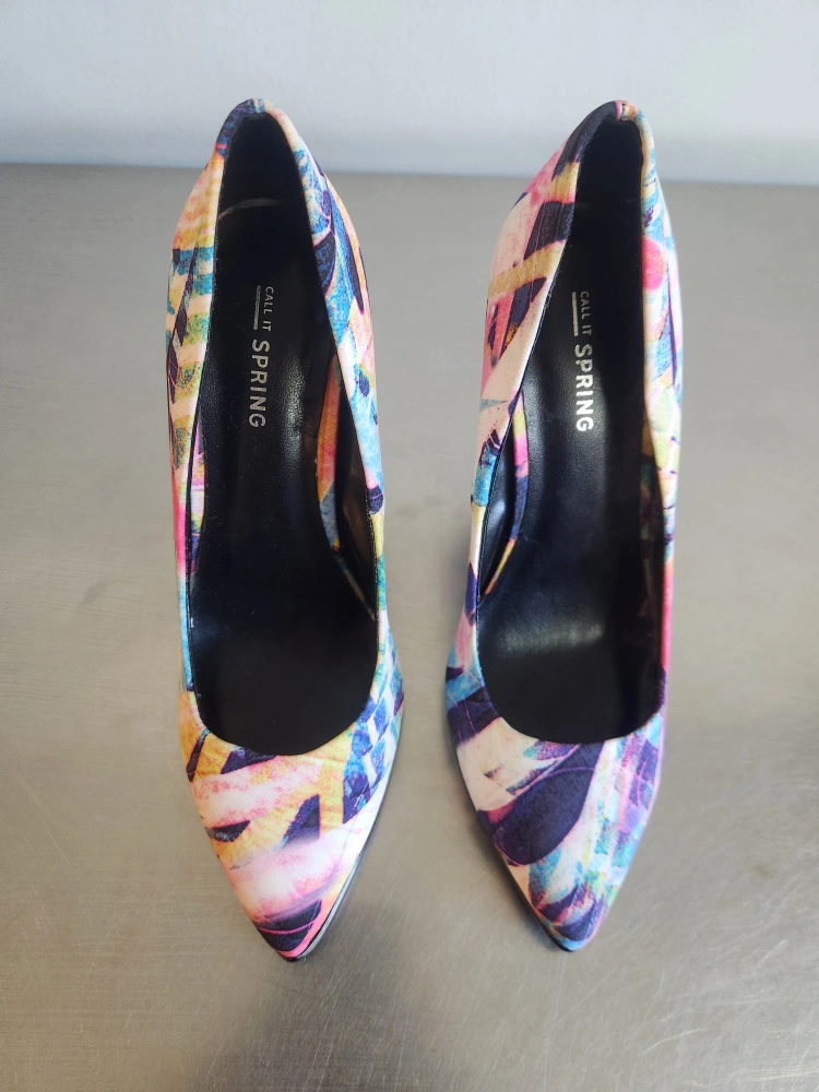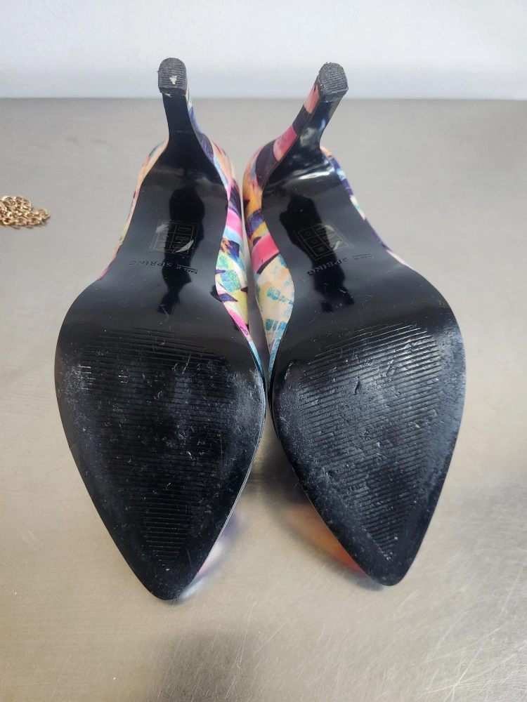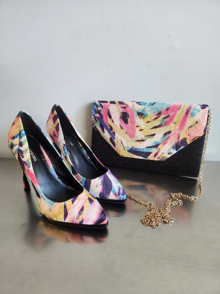 132Selling a Call It Spring heels and clutch set! The heels have a fun, colourful pattern. The clutch has a gold chain.