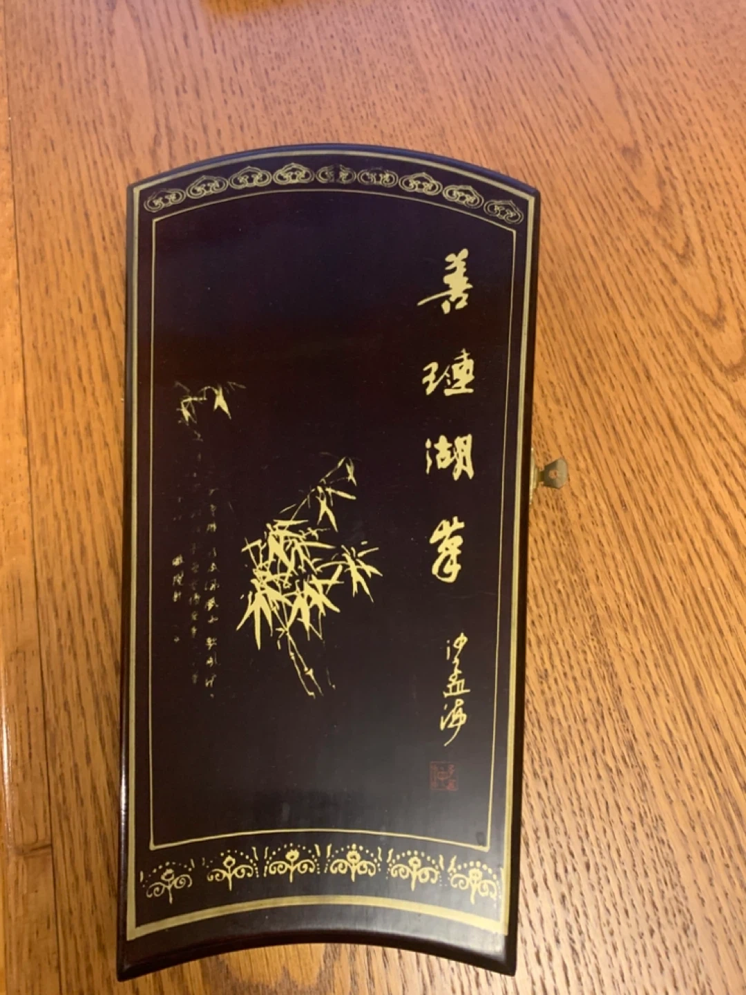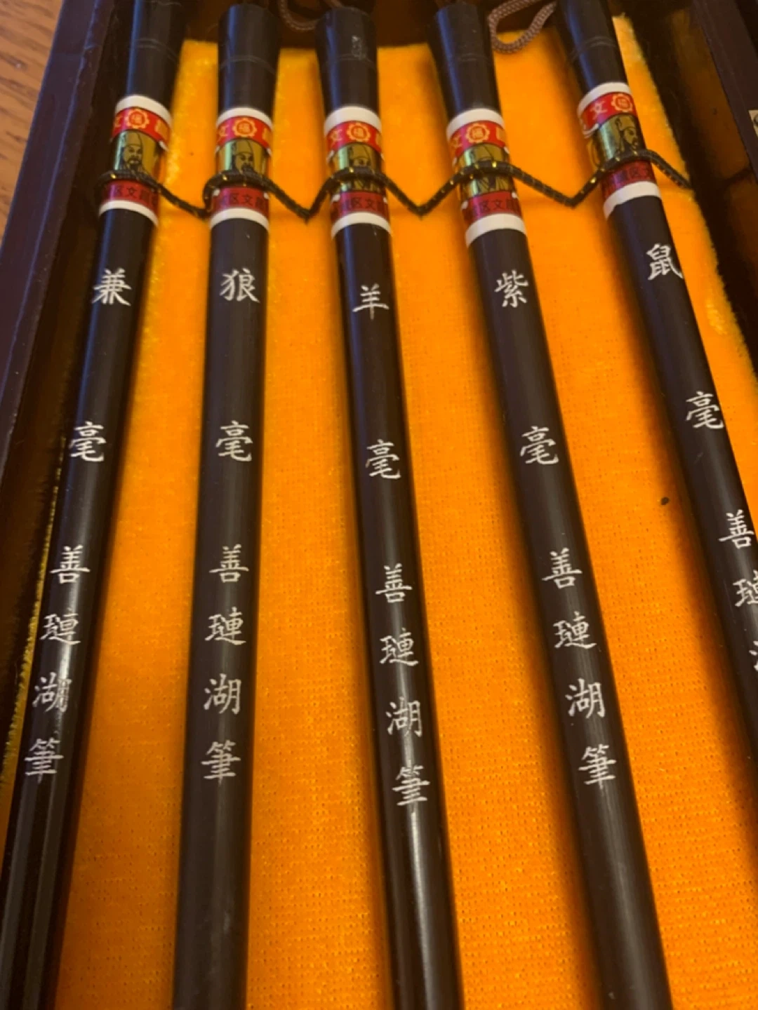 Here's a set of calligraphy brushes in a beautiful case. The brushes are in great shape and ready for your artistic touch! The case is also very attractive and would look great on a desk or shelf