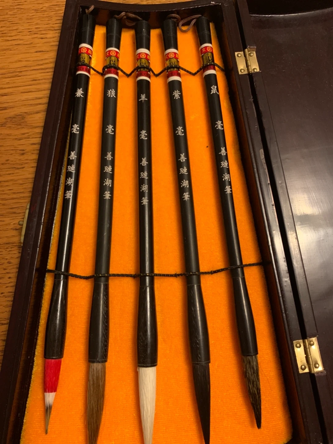 Selling a set of calligraphy brushes, complete with a wooden case for storage and protection. The brushes are in good condition and ready for use. Perfect for anyone interested in calligraphy or traditional art forms!