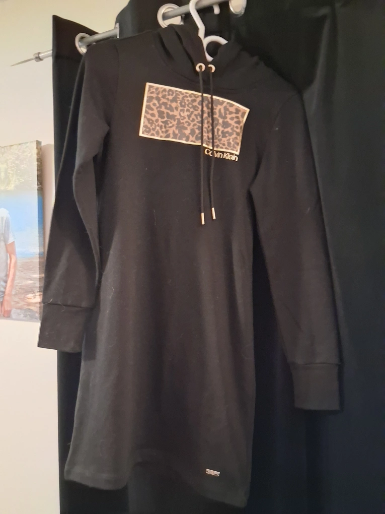 10Selling a Calvin Klein black hoodie dress. It features a leopard print design on the front. It's in great condition and would be a stylish addition to your wardrobe!