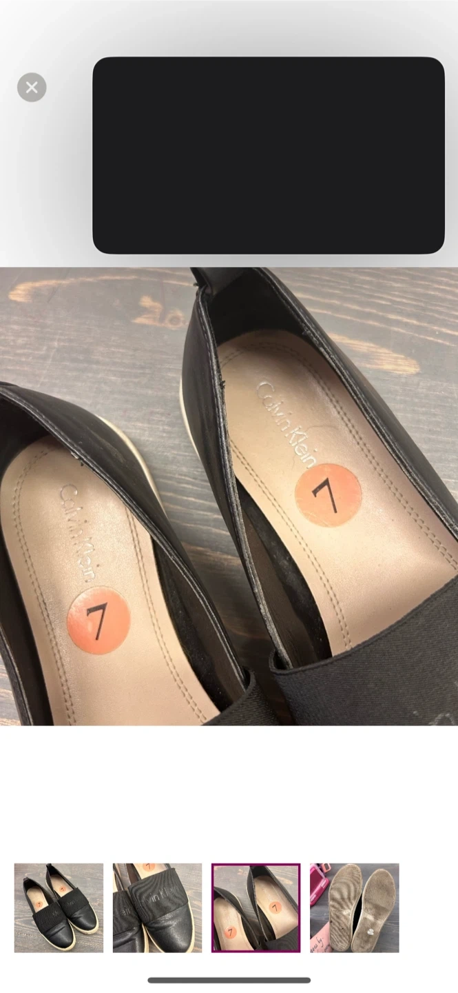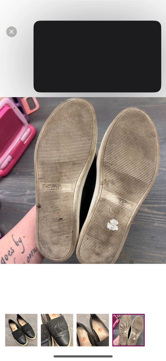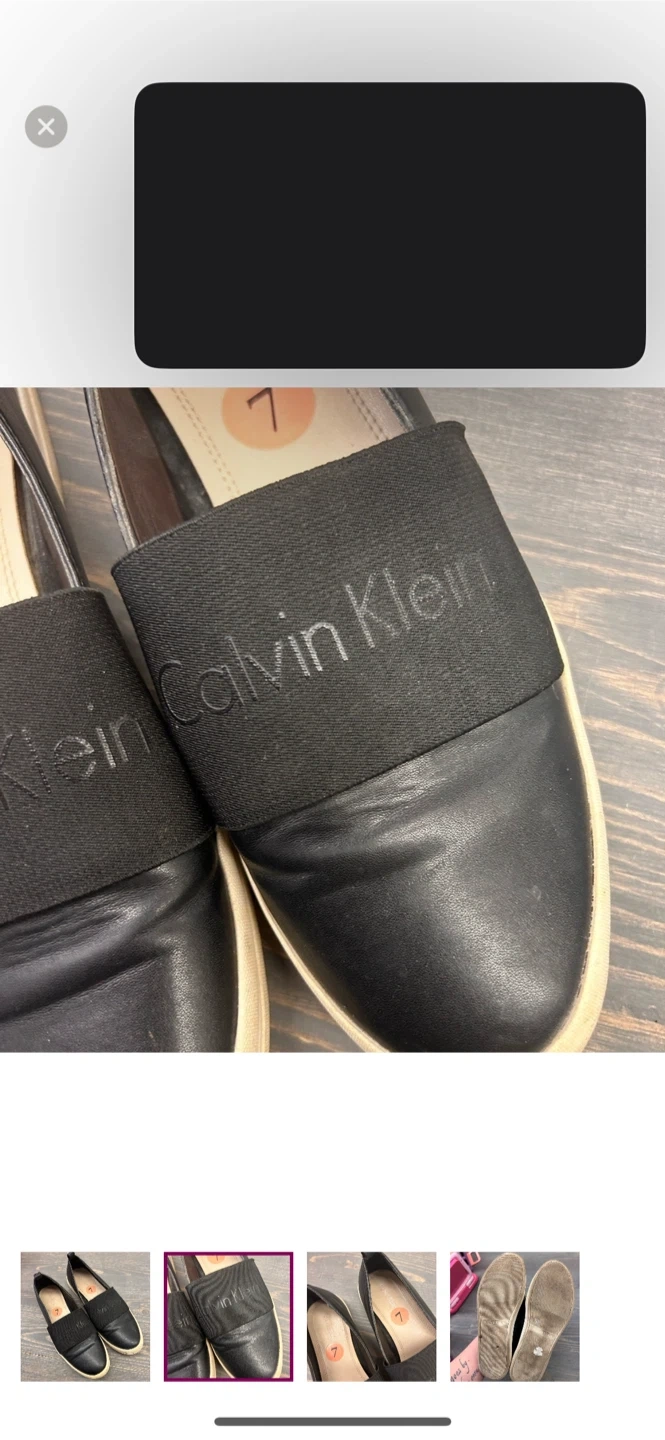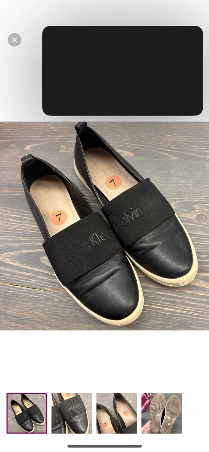 Calvin Klein brand. Black slip on shoes. Size 7. Like new condition $10 Pickup between kincardine & ripley or I can arrange delivery in port Elgin-Owen sound, walkerton-Durham, wingham-listowel-kw/cambridge, goderich-bayfield, Woodstock & Arthur-Orangeville-Newmarket-Lindsay-Peterborough AREAS.