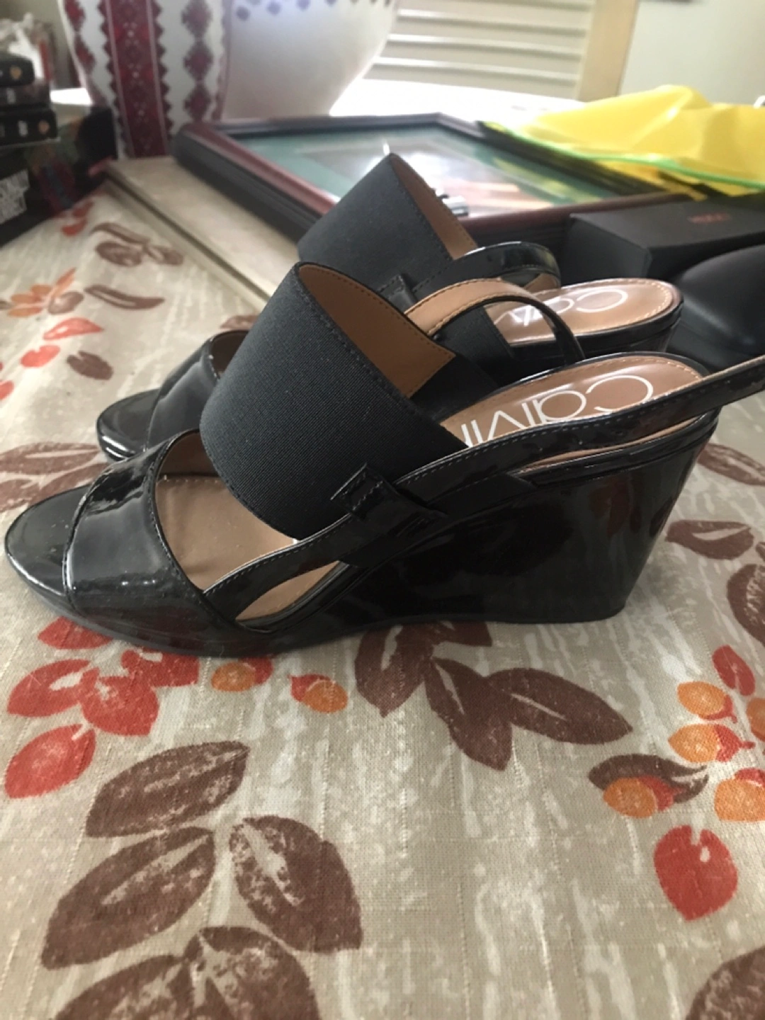 Cute black Calvin Klein wedge sandals in size 6. They feature a patent leather-look finish and an elastic strap for comfort. Perfect for dressing up or down!
