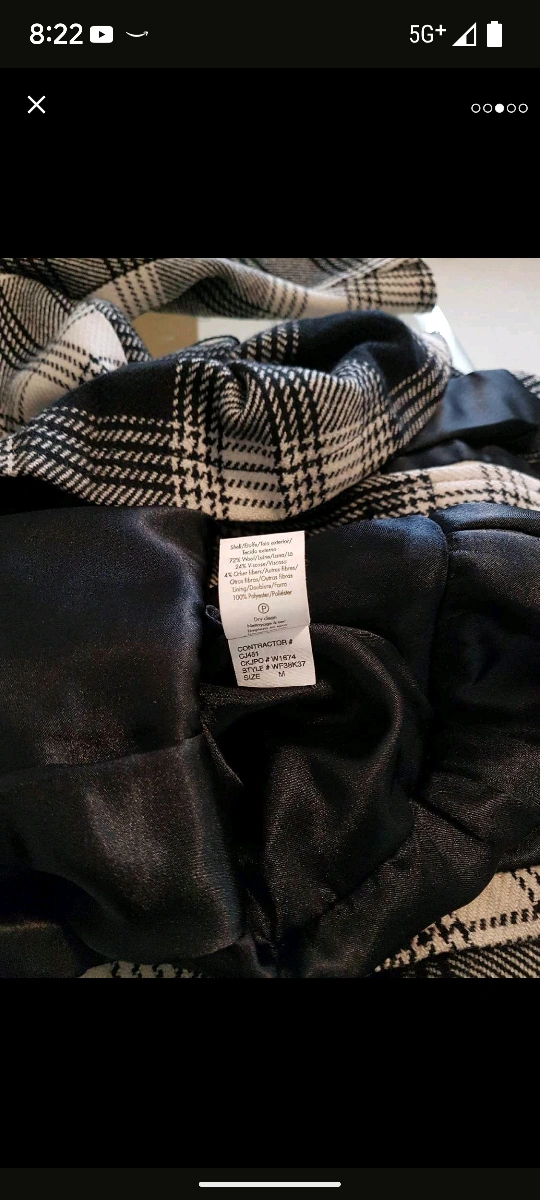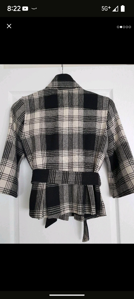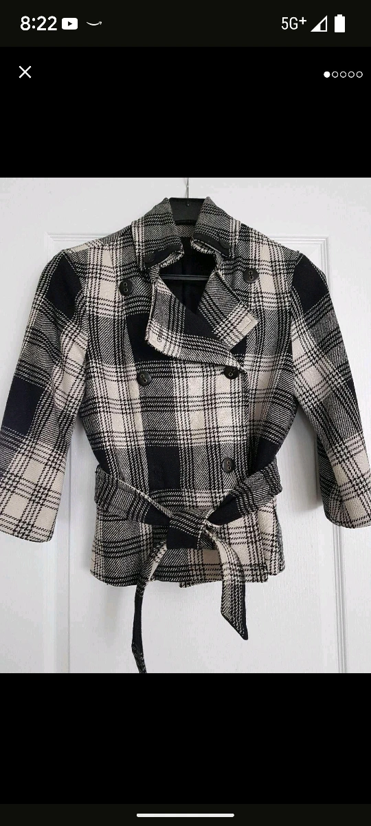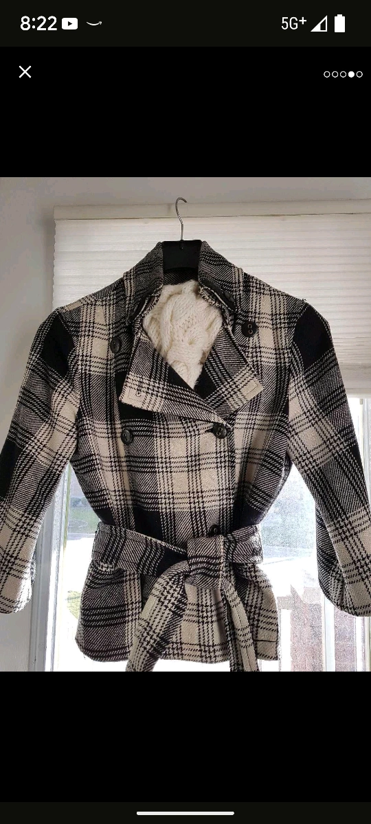 Cozy up in this chic and stylish plaid jacket! It features a belted waist and a classic double-breasted design. Perfect for adding a touch of sophistication to your wardrobe. The size is M, the equivalent of size 10-12. Barely worn. Missing one button but is covered with the belt. From clean and smoke free home.