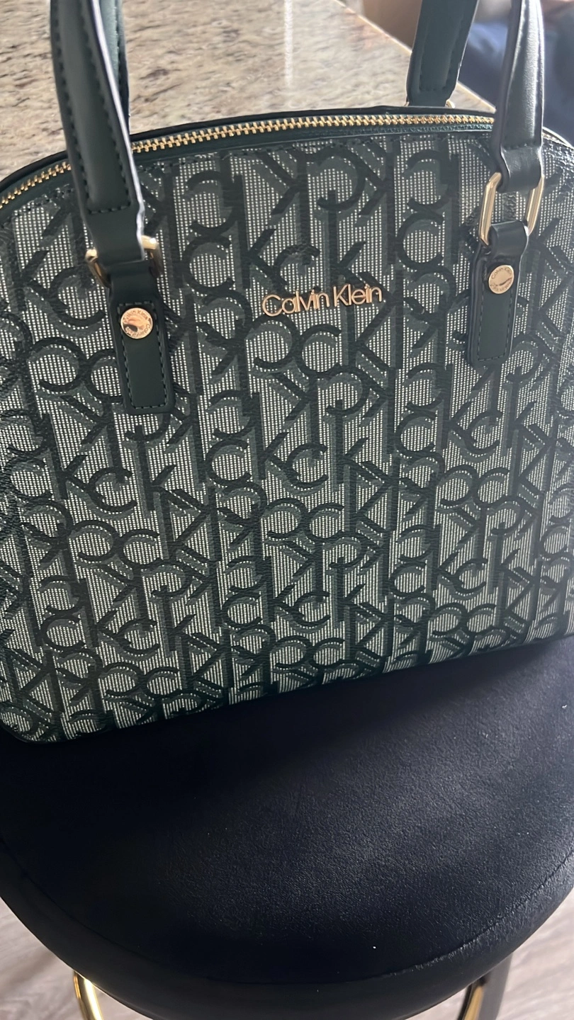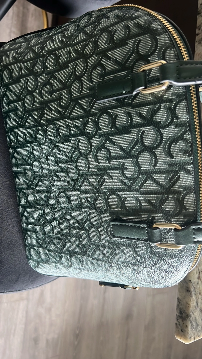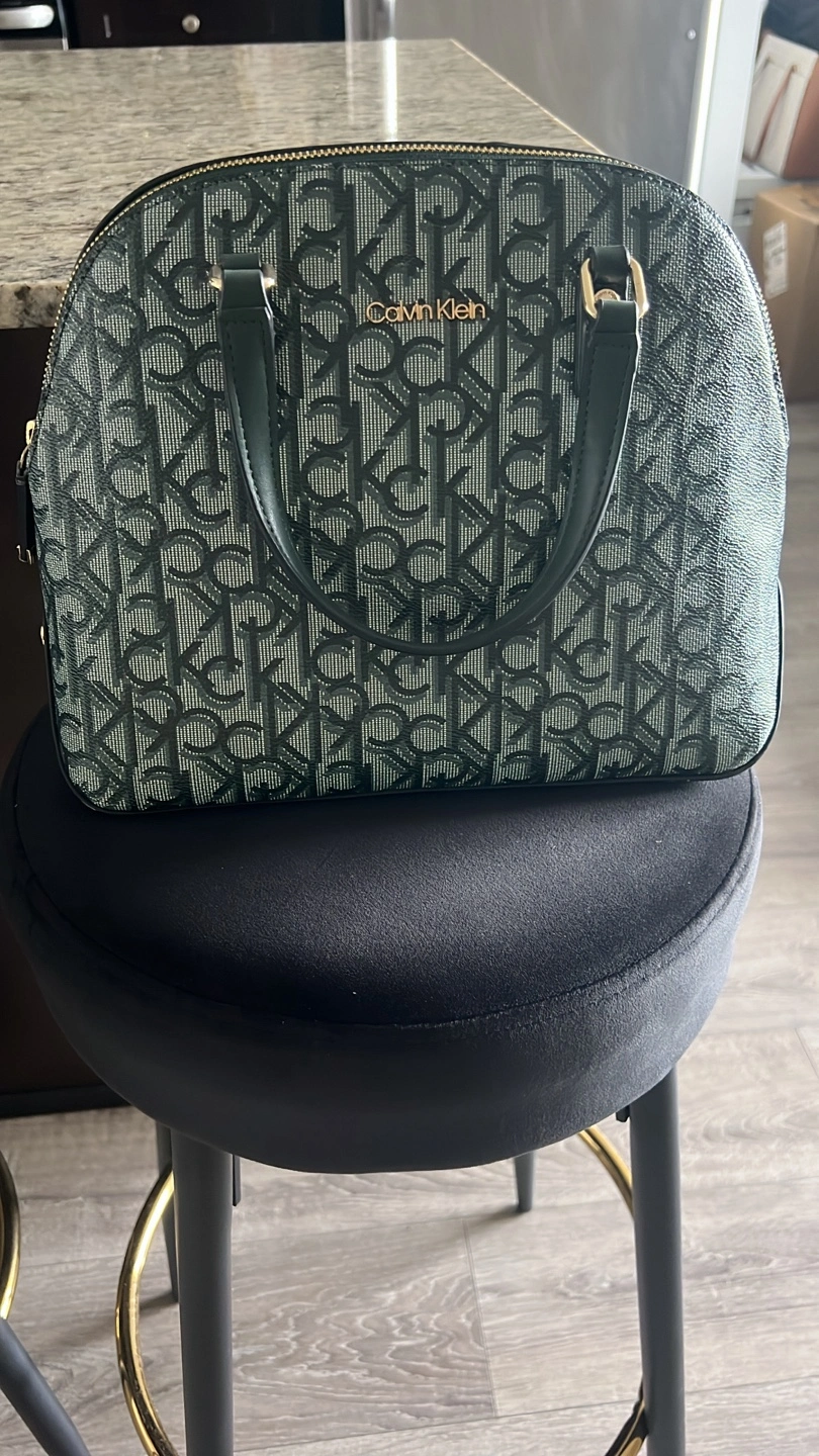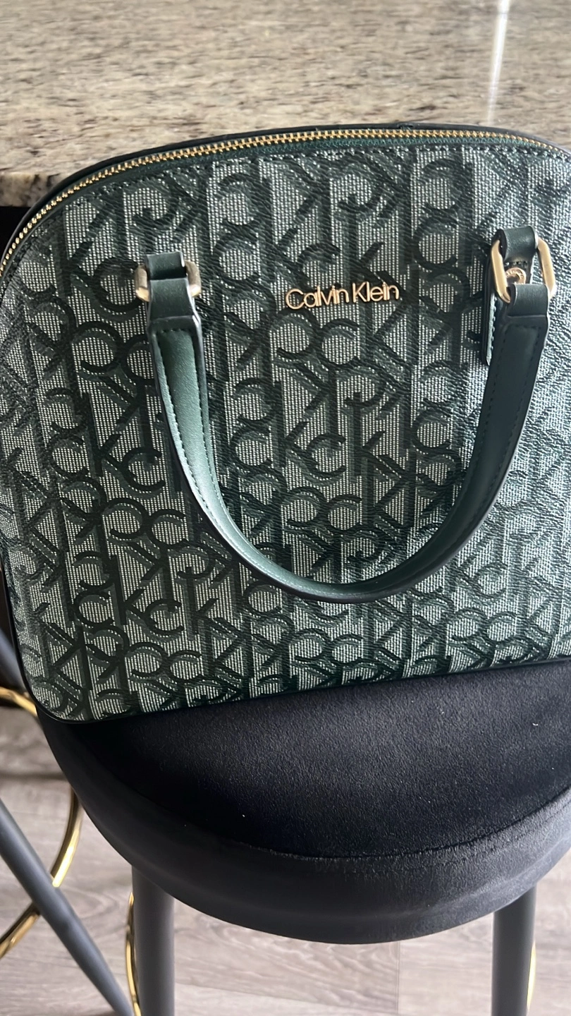 Green dome satchel. Features a zip closure, double top handles, and an all-over monogram pattern.