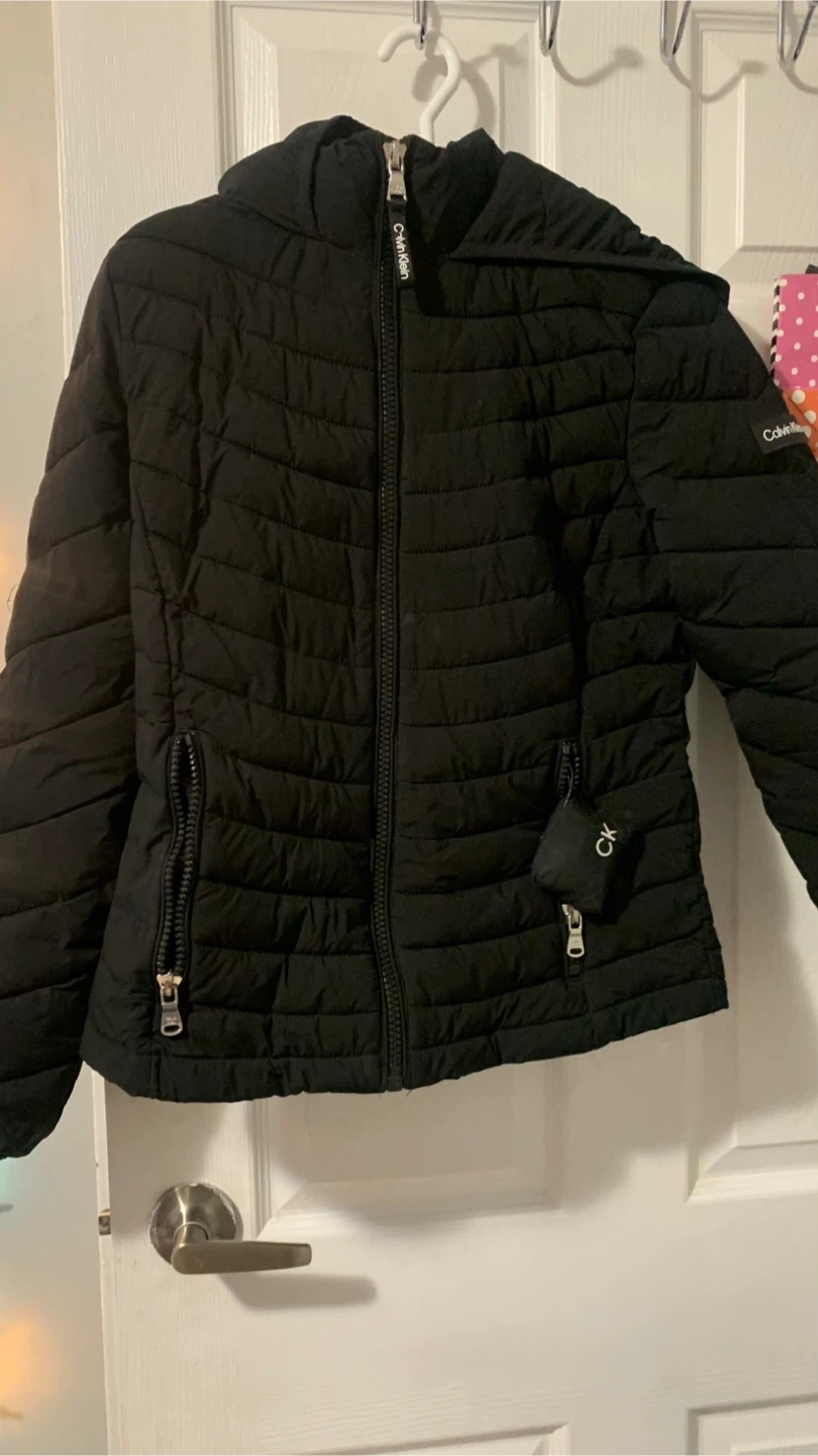 Selling a Calvin Klein Infinite Stretch puffer jacket in size S/P. It's black and features a packable, compressible design, making it easy to take with you on the go. The jacket is also water-resistant and made with Sorona Aura for a smoother feel and exceptional breathability