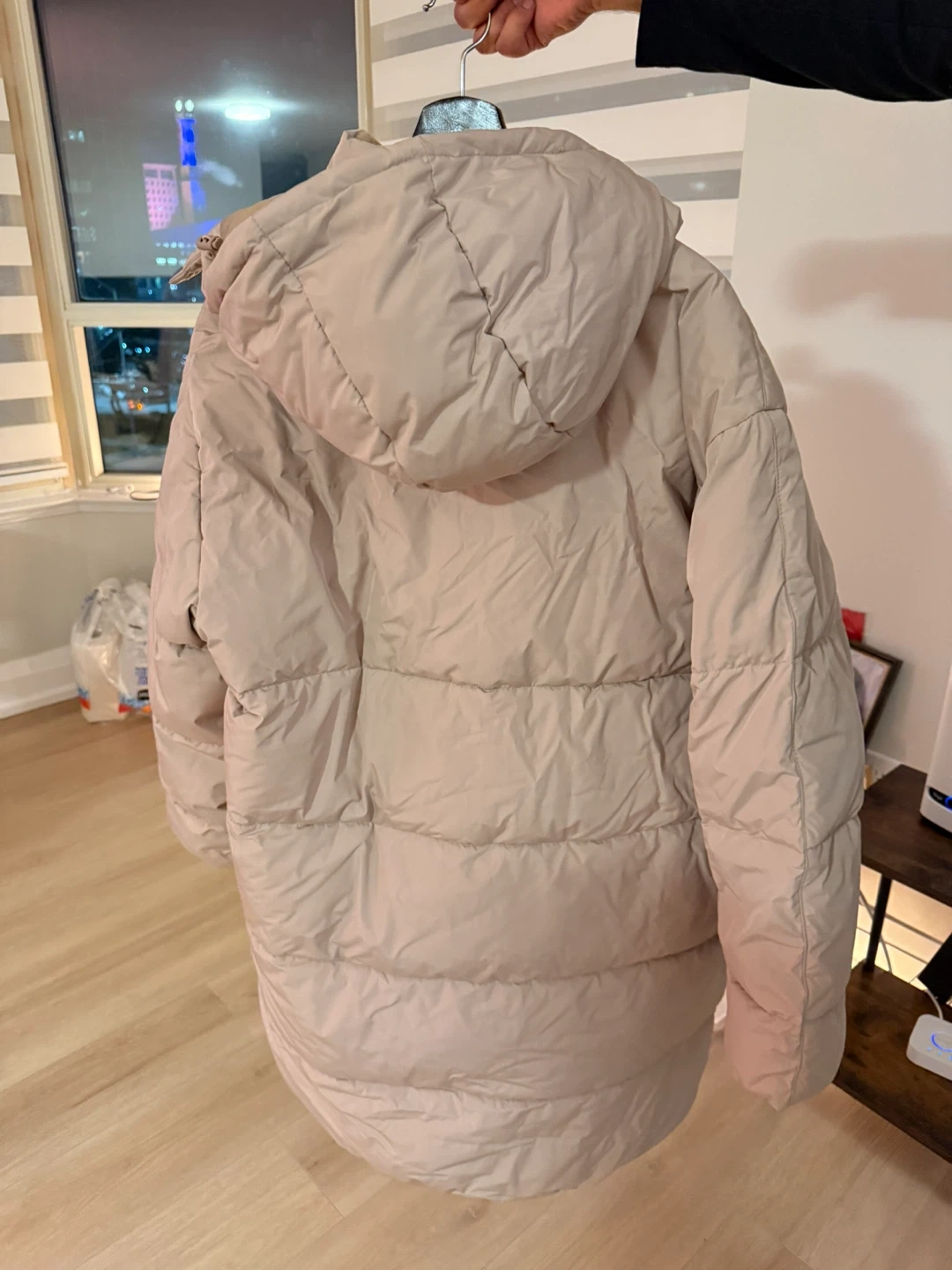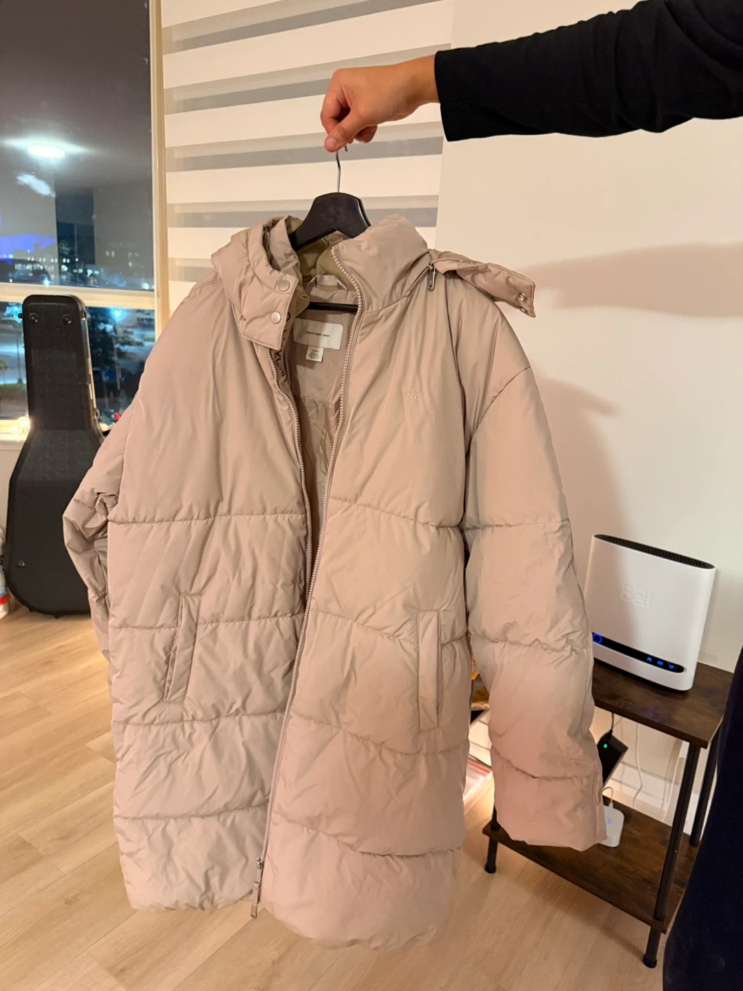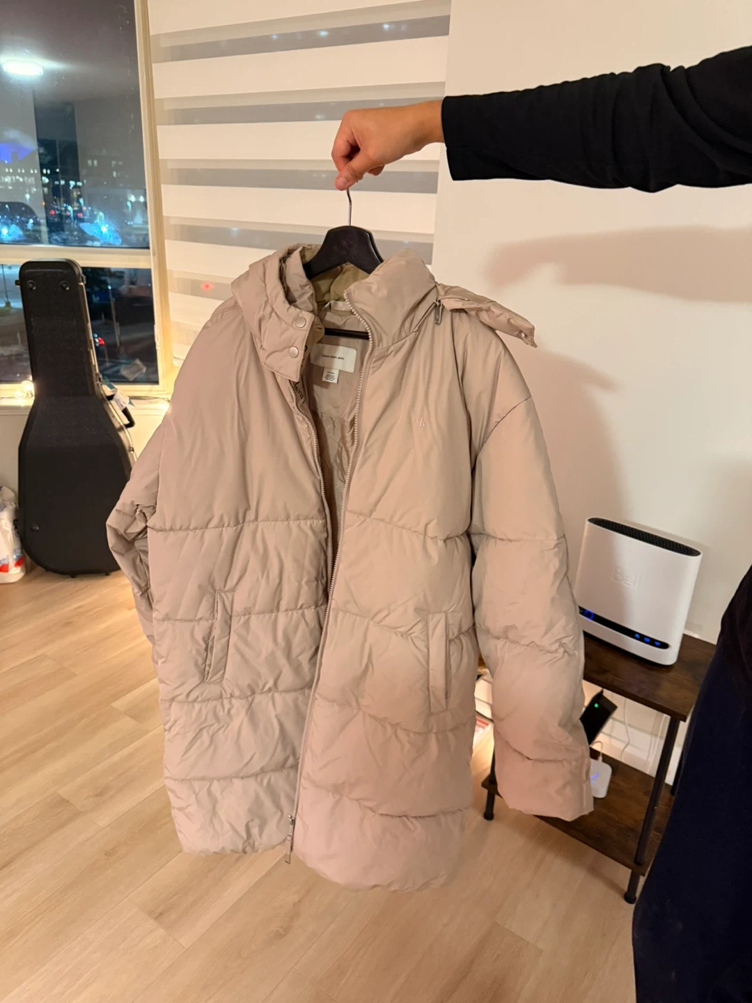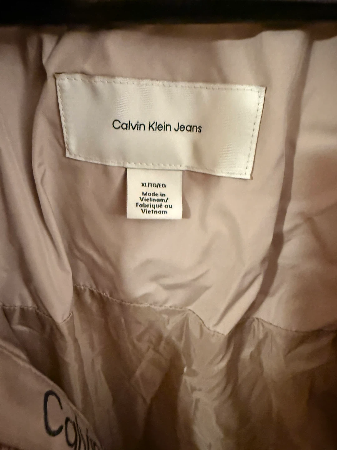 60Cozy Calvin Klein long puffer jacket in a neutral beige colour. It's a size XL. Great for staying warm this winter! (Women’s jacket)