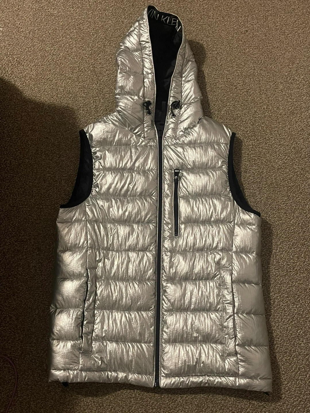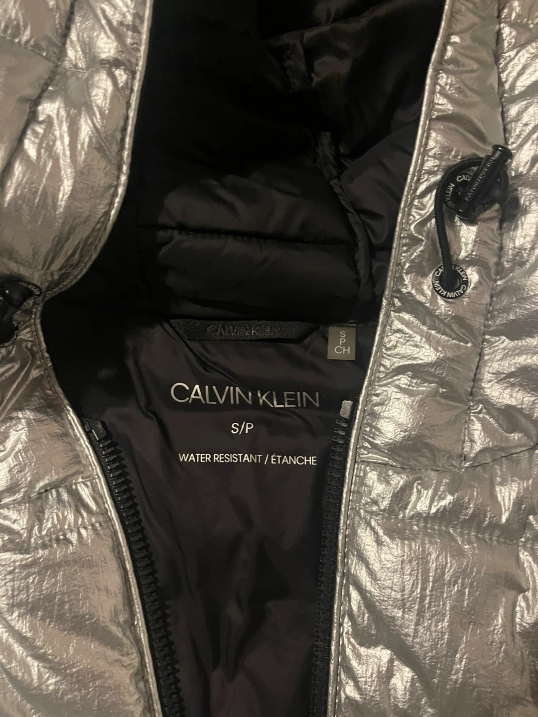 15Rare Calvin Klein puffer vest in a unique silver colour It's a size S/P (Small/Petite) and features a water-resistant design. bought 4 years ago for $200 and only wore a few times