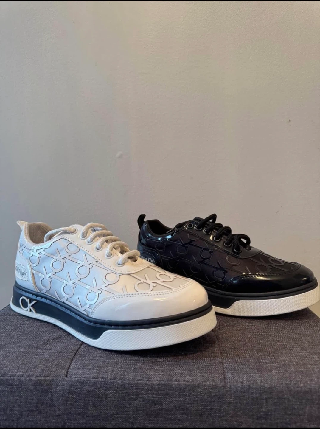 65Selling a pair of Calvin Klein sneakers, one in white and one in black. They have the CK logo pattern. Great for adding a touch of style to your everyday look!