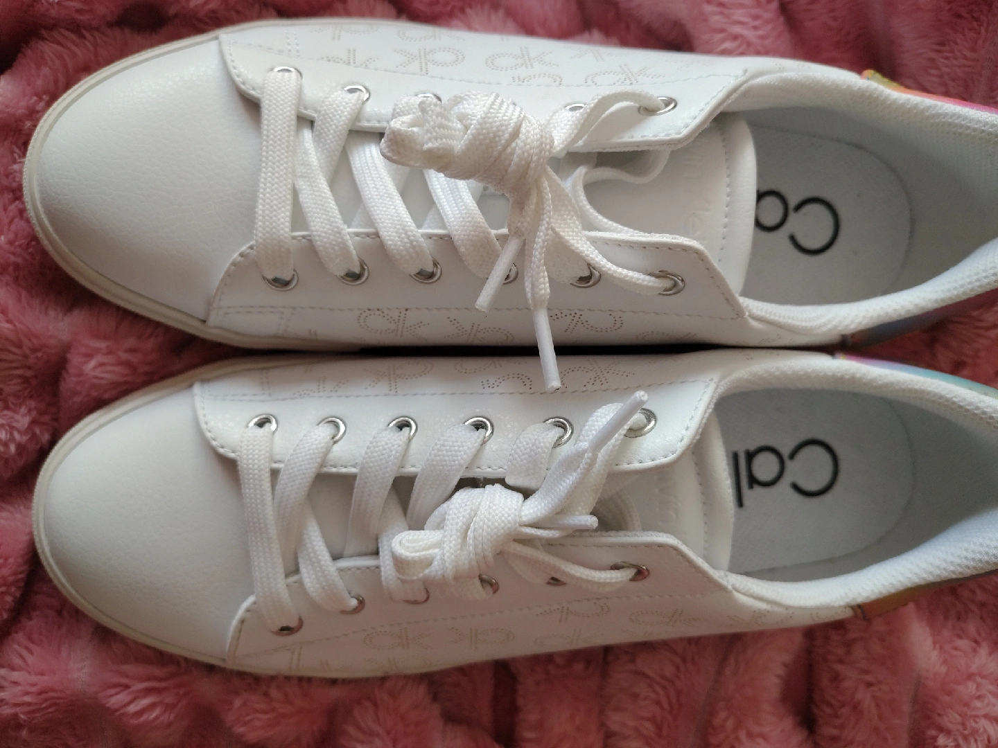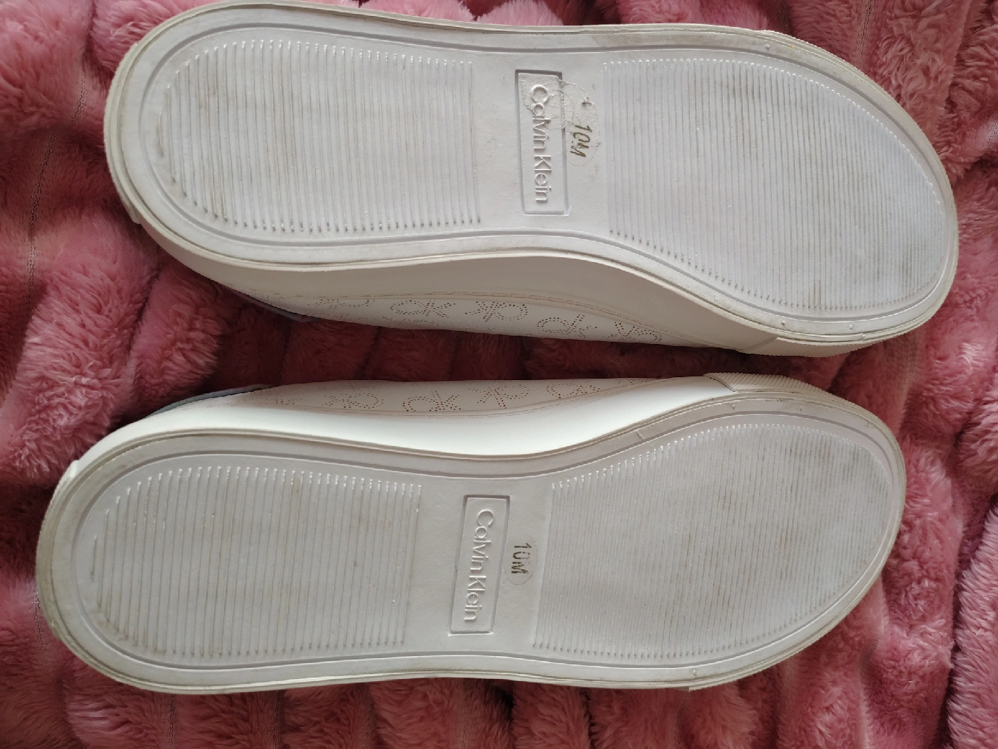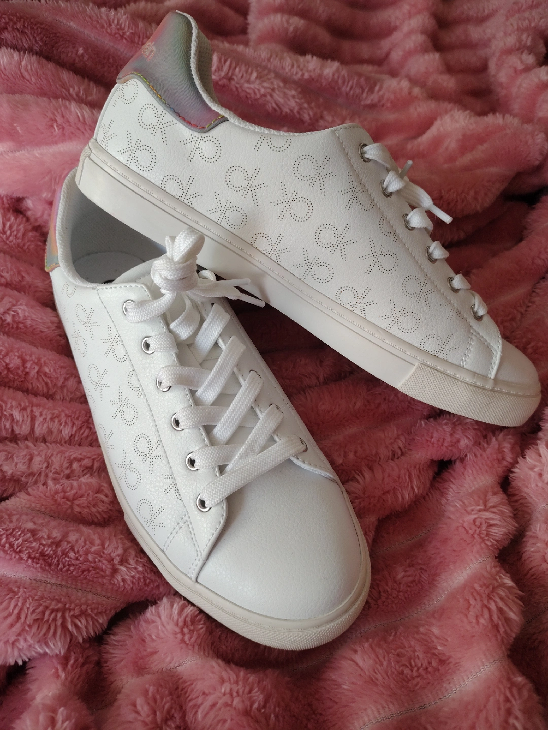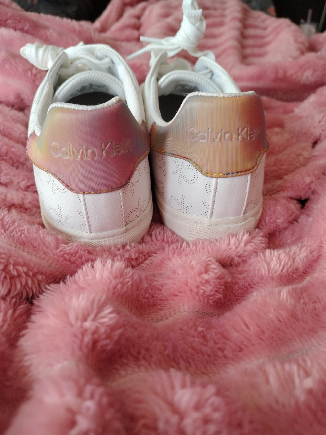 15Selling a pair of women's Calvin Klein sneakers in white. They are a size 10M. The shoes have a subtle CK pattern and iridescent detail on heel. Only worn once, no scuffs. Paid over $100, asking $45.