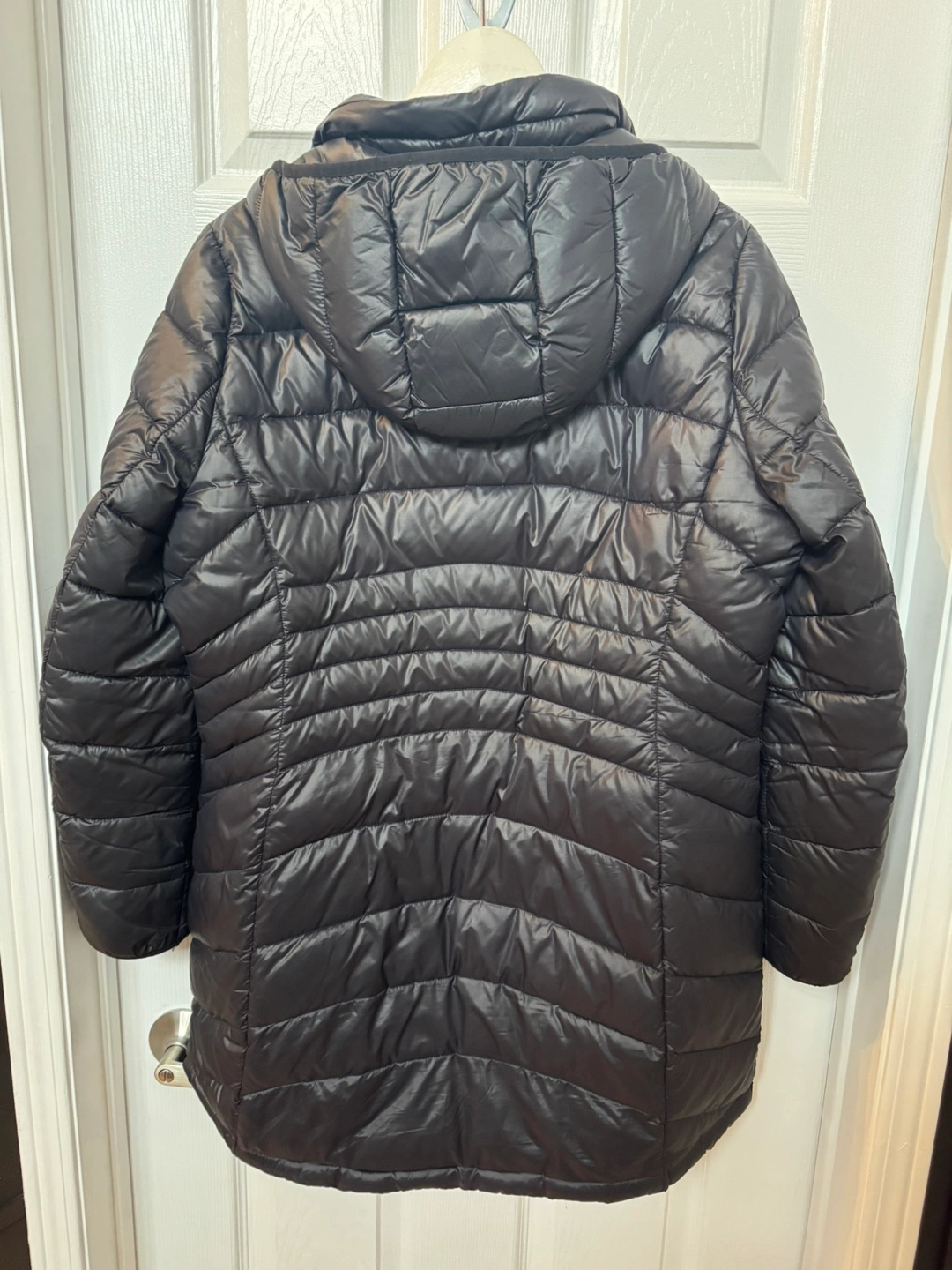 Long black puffer jacket. Premium down blend. Packable and compressible. Size large/grande.