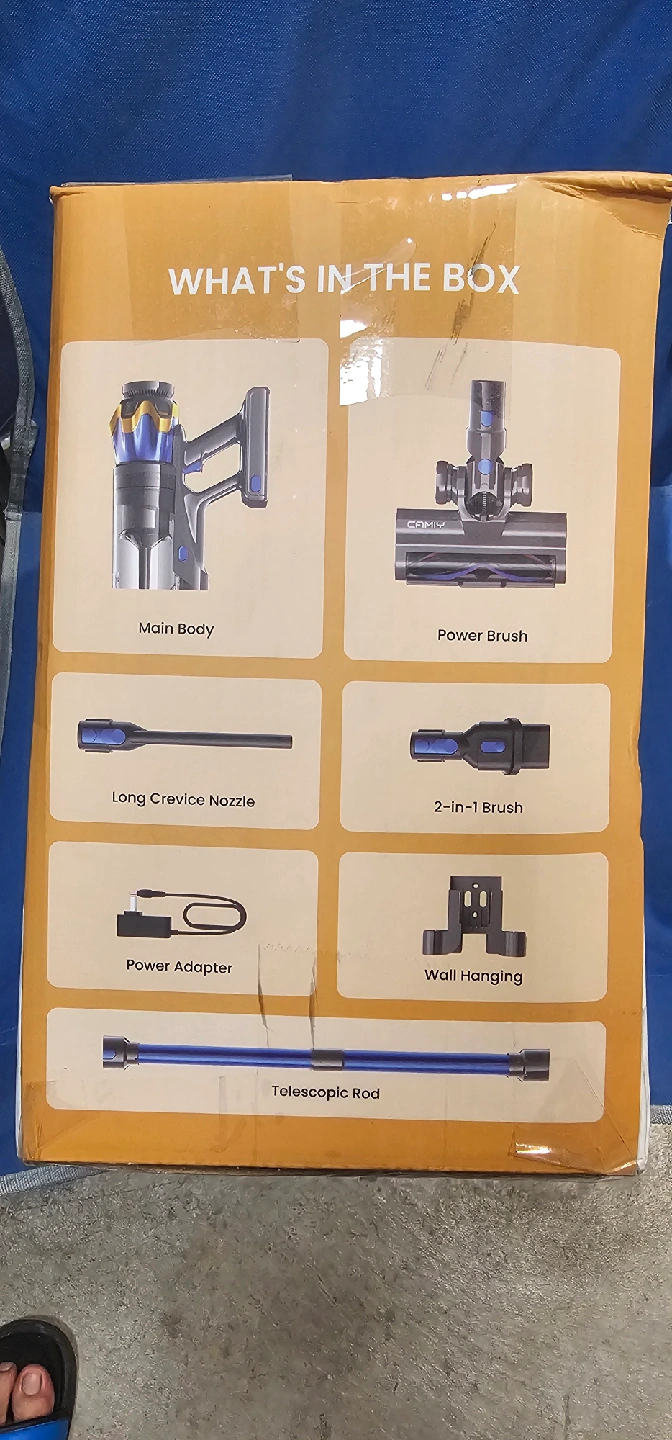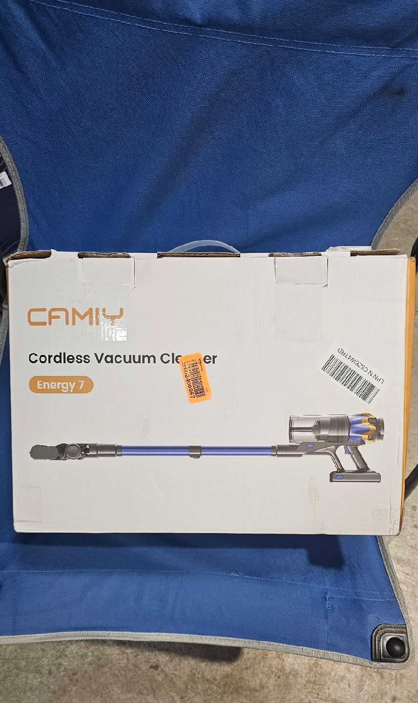 Selling a CAMI4U Cordless Vacuum Cleaner, Energy 7. It comes in its original box and includes all the components: the main body, power brush, long crevice nozzle, 2-in-1 brush, power adapter, wall hanging, and telescopic rod