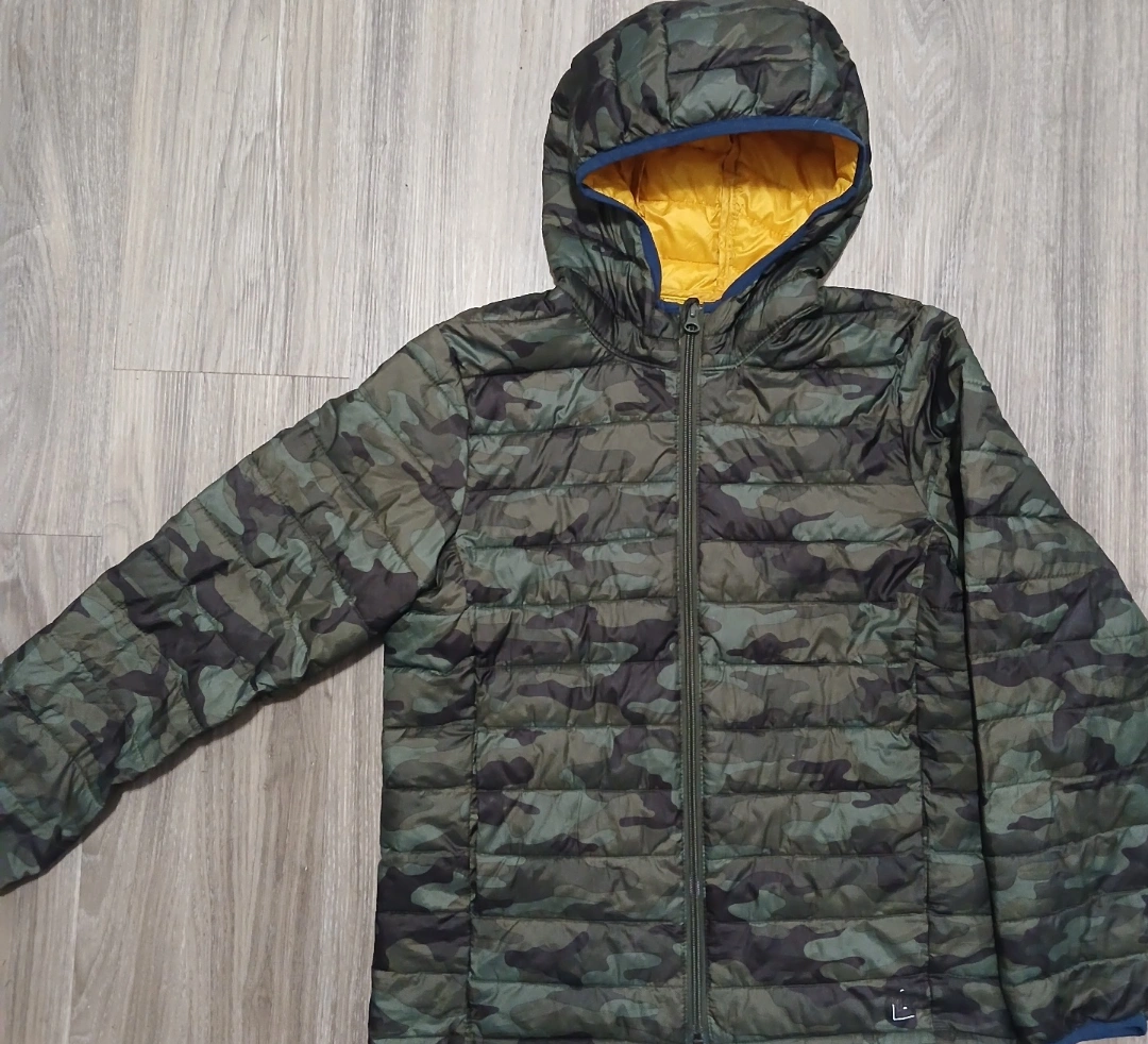 18Here's a warm and stylish camo puffer jacket! It features a cool camouflage pattern on the outside and a bright yellow lining inside the hood. Perfect for staying cozy during those chilly days! size XL