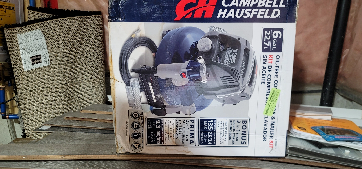65Looking to sell this Campbell Hausfeld air compressor and nailer kit. It's a 6-gallon, oil-free compressor with a 2-in-1 brad nailer and stapler kit. The compressor delivers 135 max PSI and 2.6/2.4 CFM at 90/40 PSI. Ideal for various tasks like carpentry, repair work, and upholstery