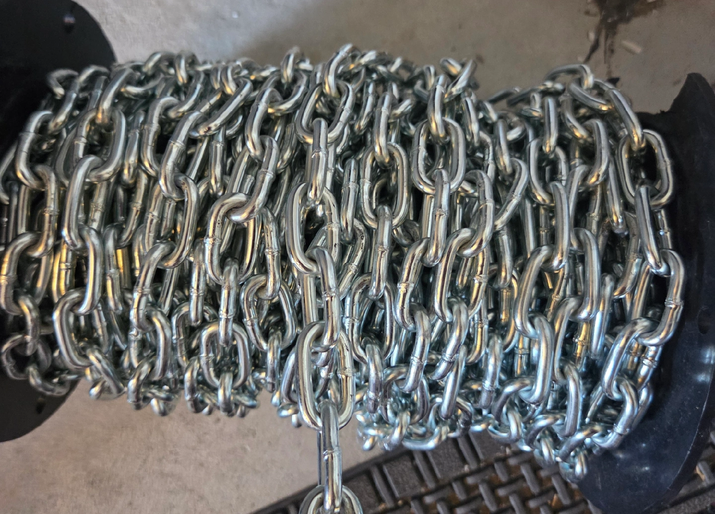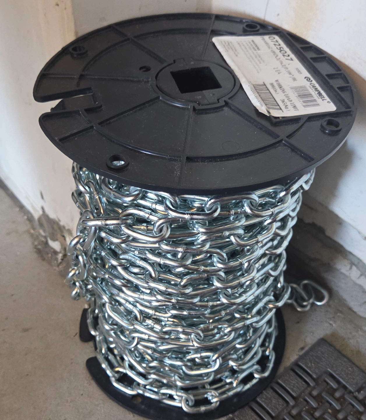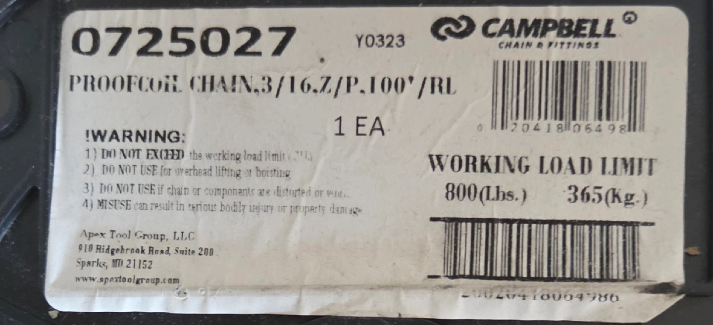 Selling a roll of Campbell Proof Coil Chain. It's 3/16 inch thick and 75 feet long. The working load limit is 800 lbs (365 kg).