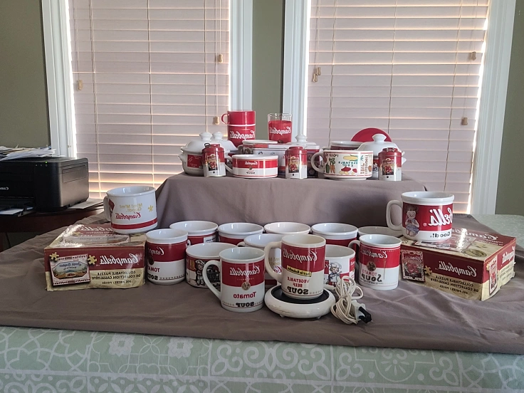 I'm selling a collection of Campbell's Soup themed mugs and collectibles! There are mugs with various Campbell's Soup designs, along with other items like salt and pepper shakers and a puzzle. These would be great for a collector or anyone who loves Campbell's Soup!