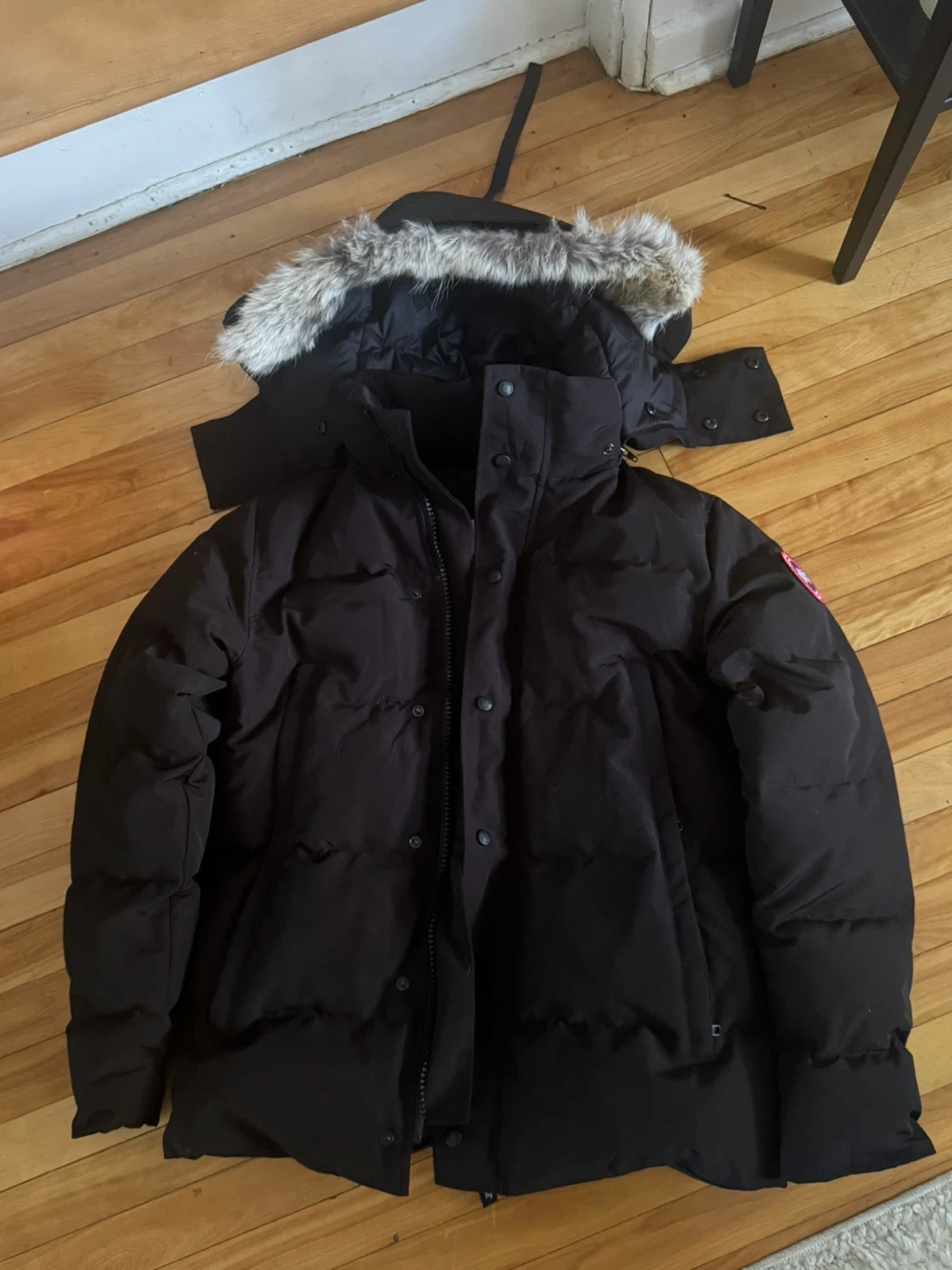 Selling a Canada Goose down parka in black. It's in great condition and super warm for those cold Canadian winters! The parka features a fur-trimmed hood and the classic Canada Goose logo on the arm. Perfect for staying cozy and stylish!