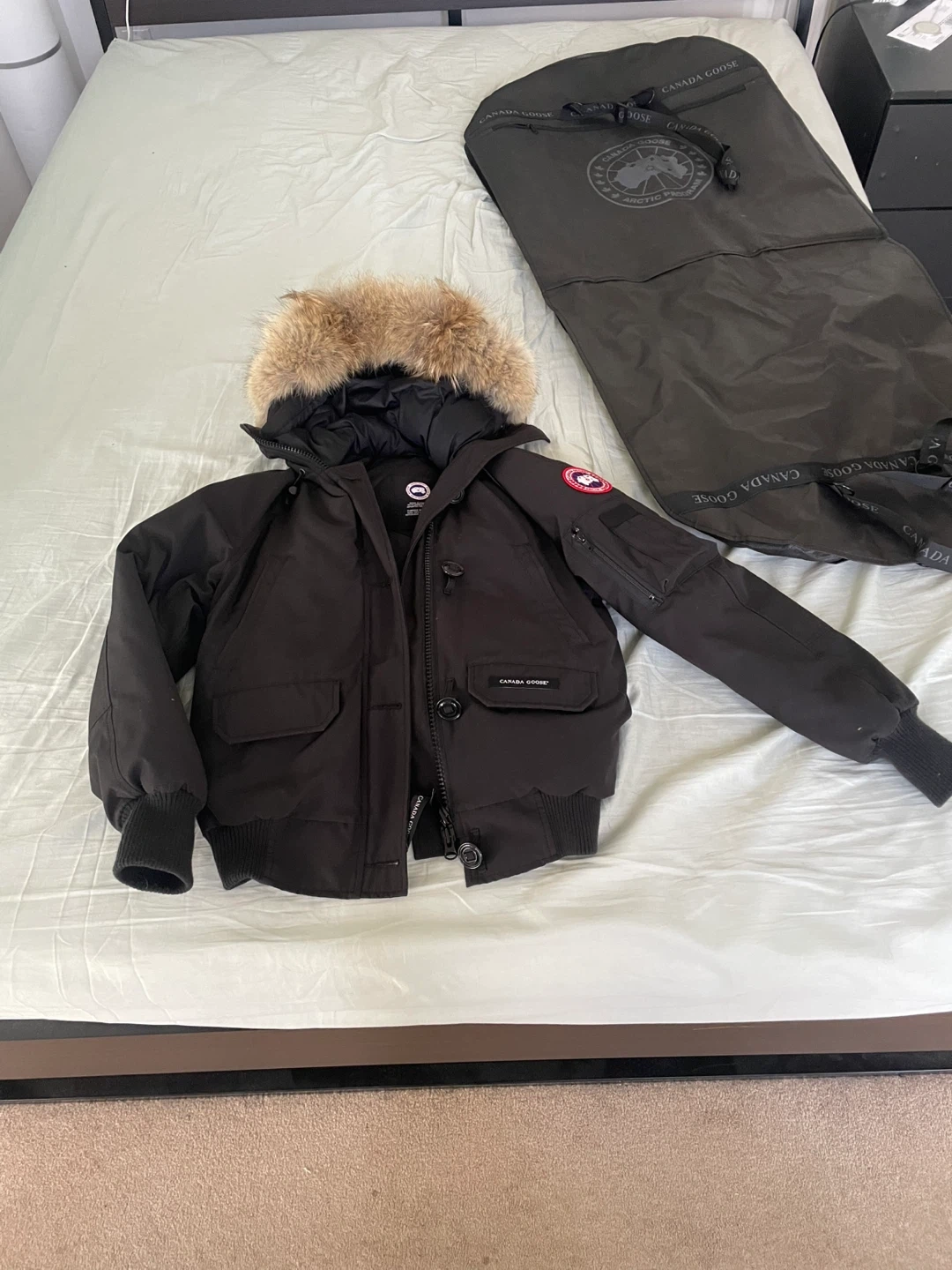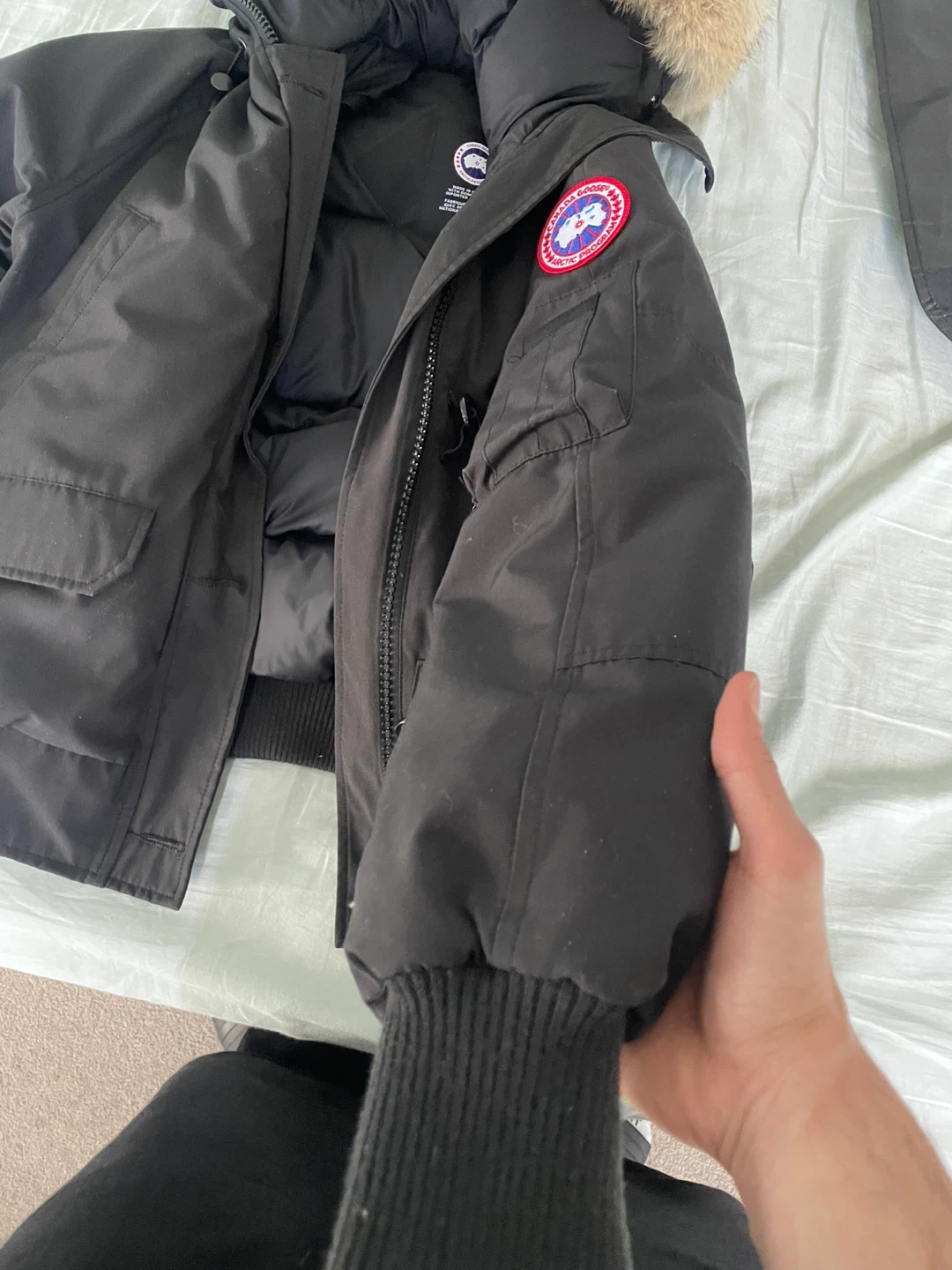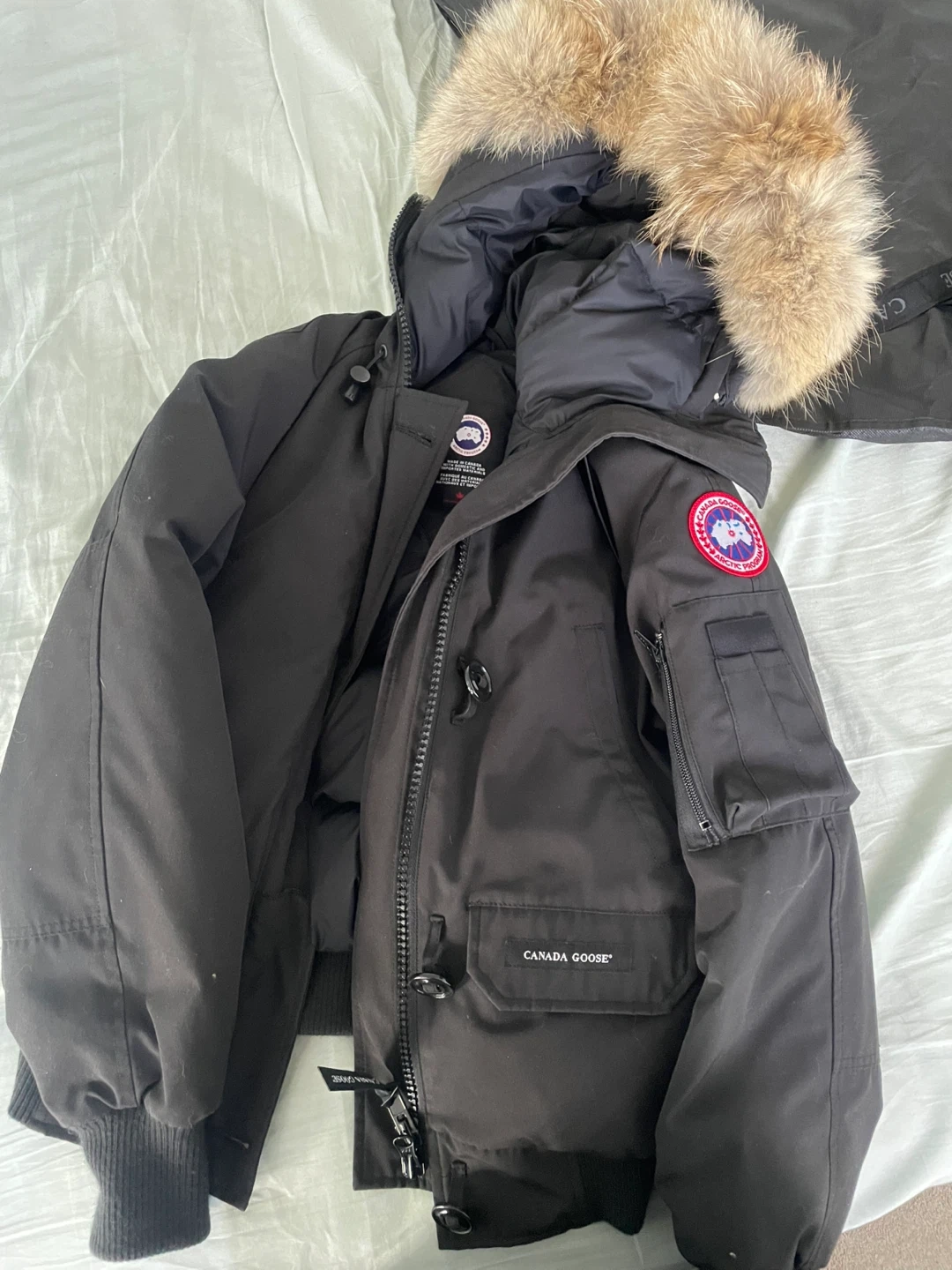 81Selling a Canada Goose bomber jacket in black. It's a size small. In great condition and ready for a new home! Barely worn and comes with the receipt and bag and hanger.