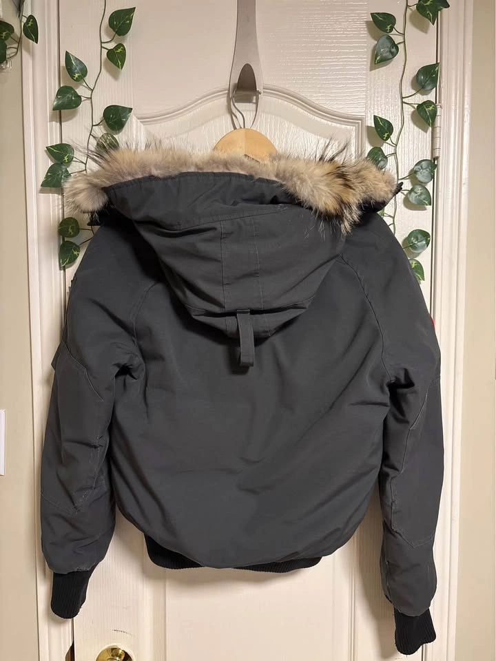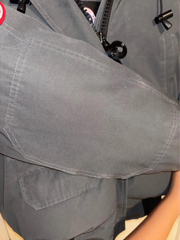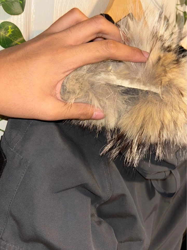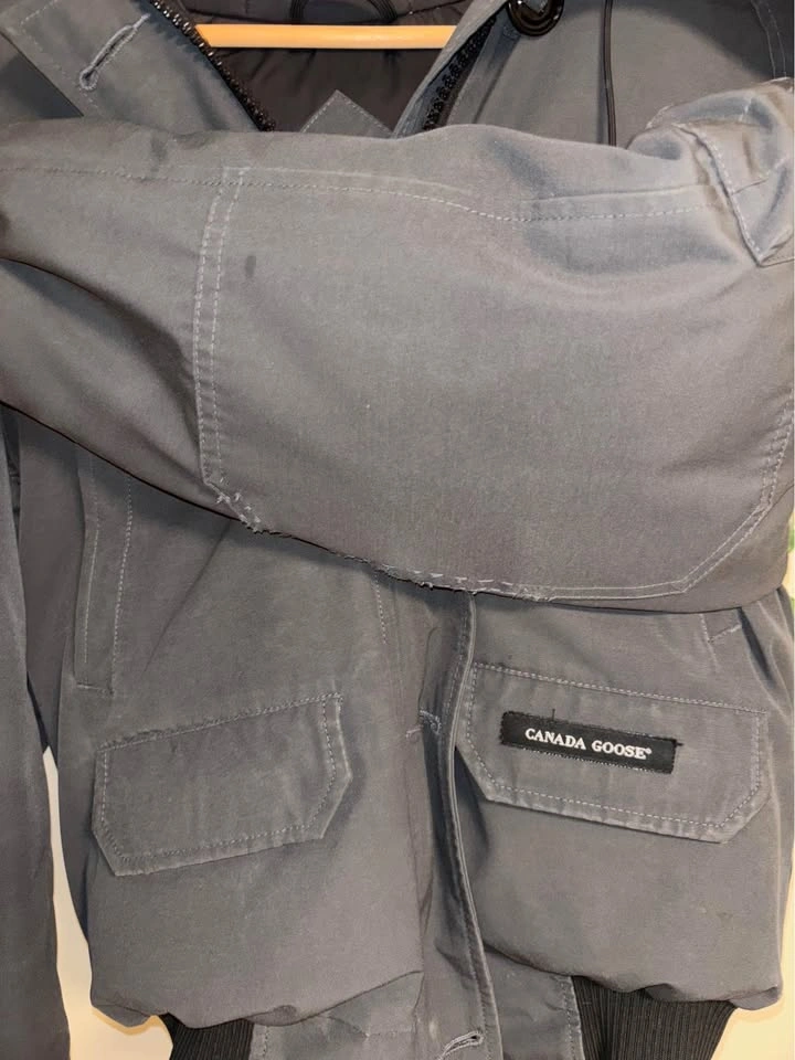 This authentic Canada Goose Chilliwack jacket in gray is heavily worn, with significant damage: • Loose stitching and re-stitching on the sleeves • A large patch of missing neck fur with visible dried glue in areas • Other signs of heavy use and wear STILL FUNCTIONAL