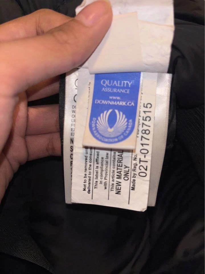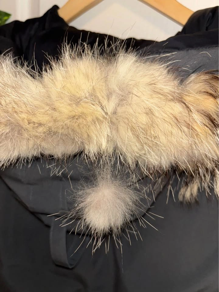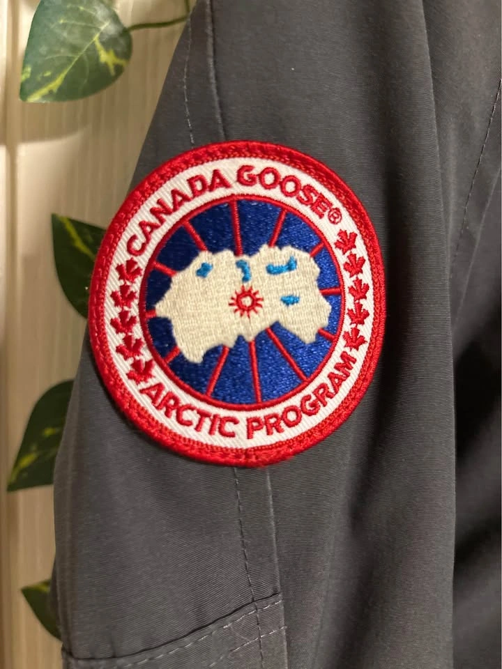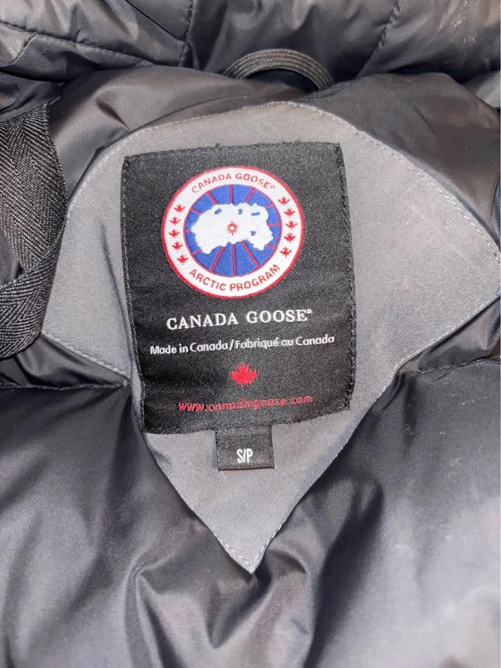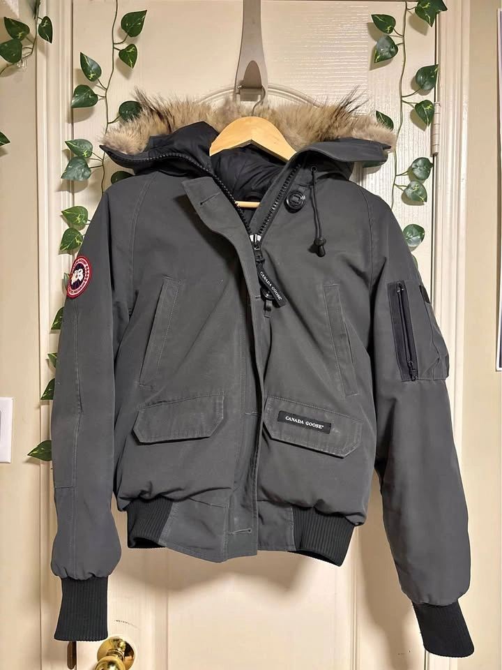 This authentic Canada Goose Chilliwack jacket in gray is heavily worn, with significant damage: • Loose stitching and re-stitching on the sleeves • A large patch of missing neck fur with visible dried glue in areas • Other signs of heavy use and wear STILL FUNCTIONAL