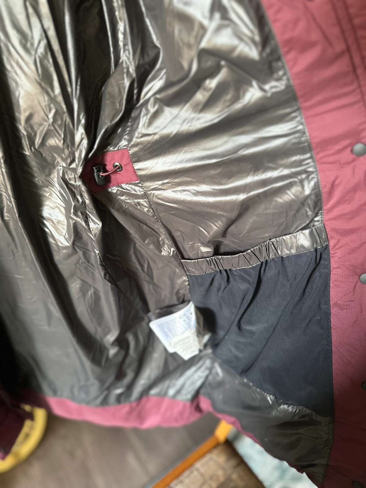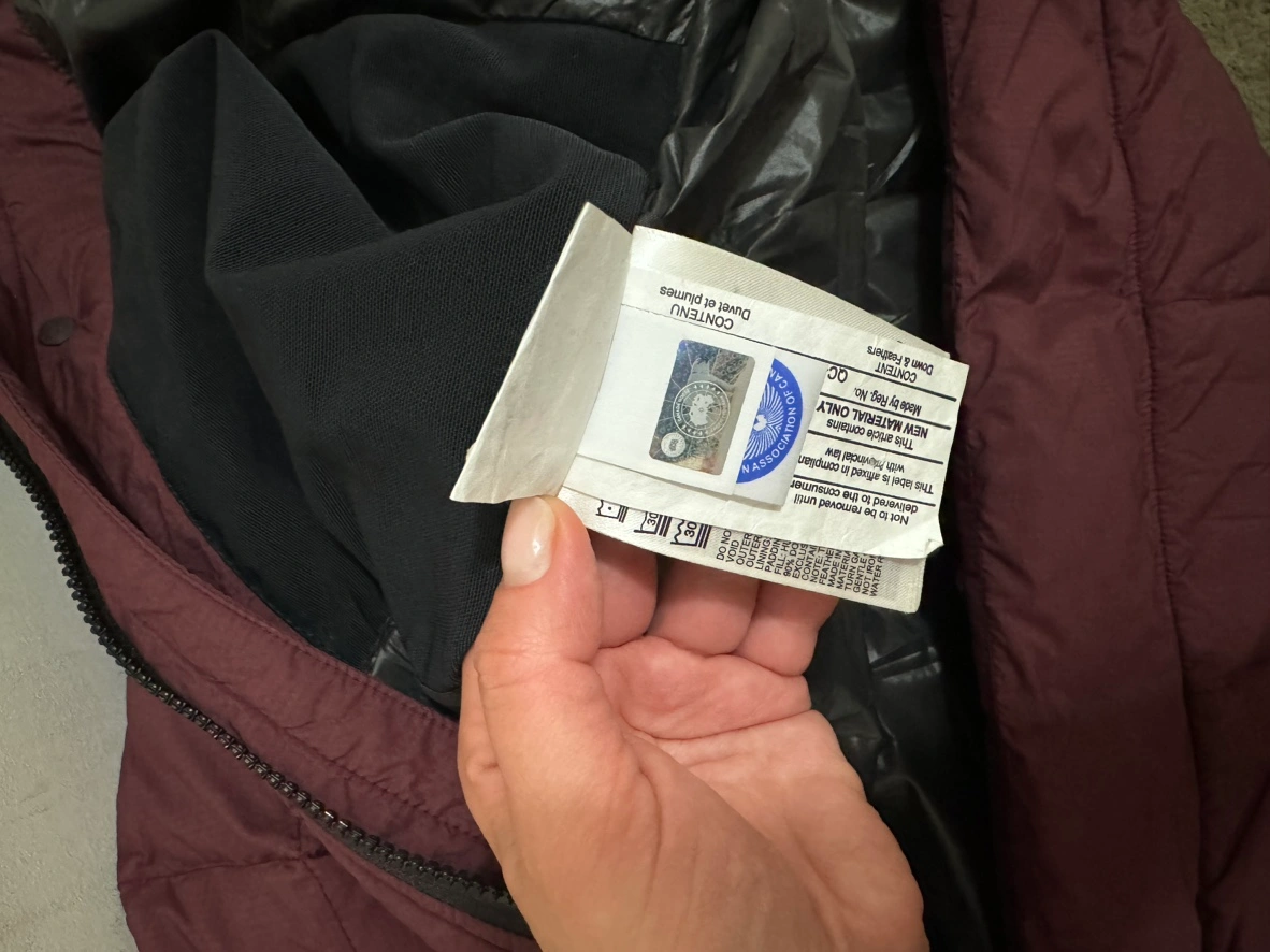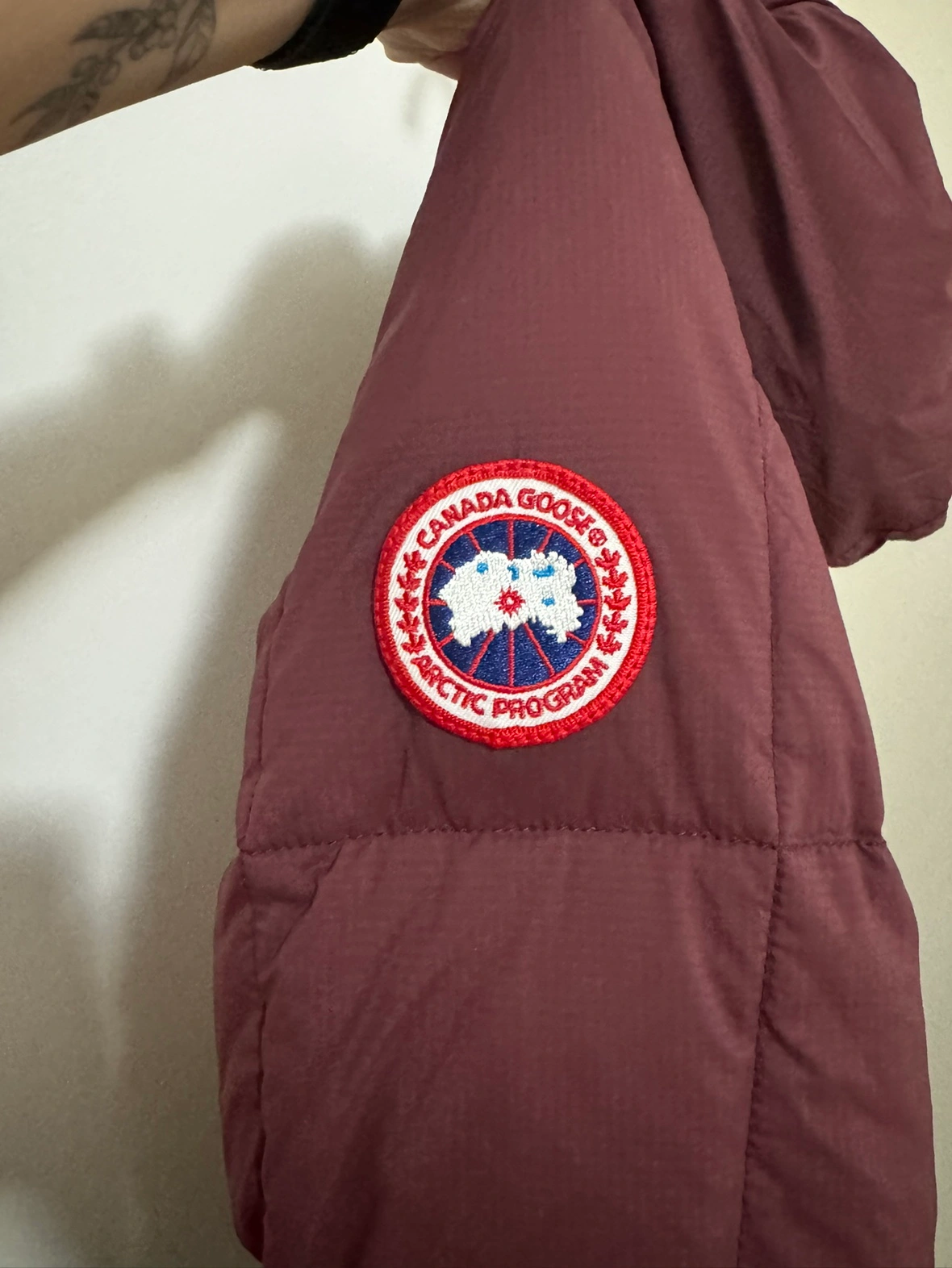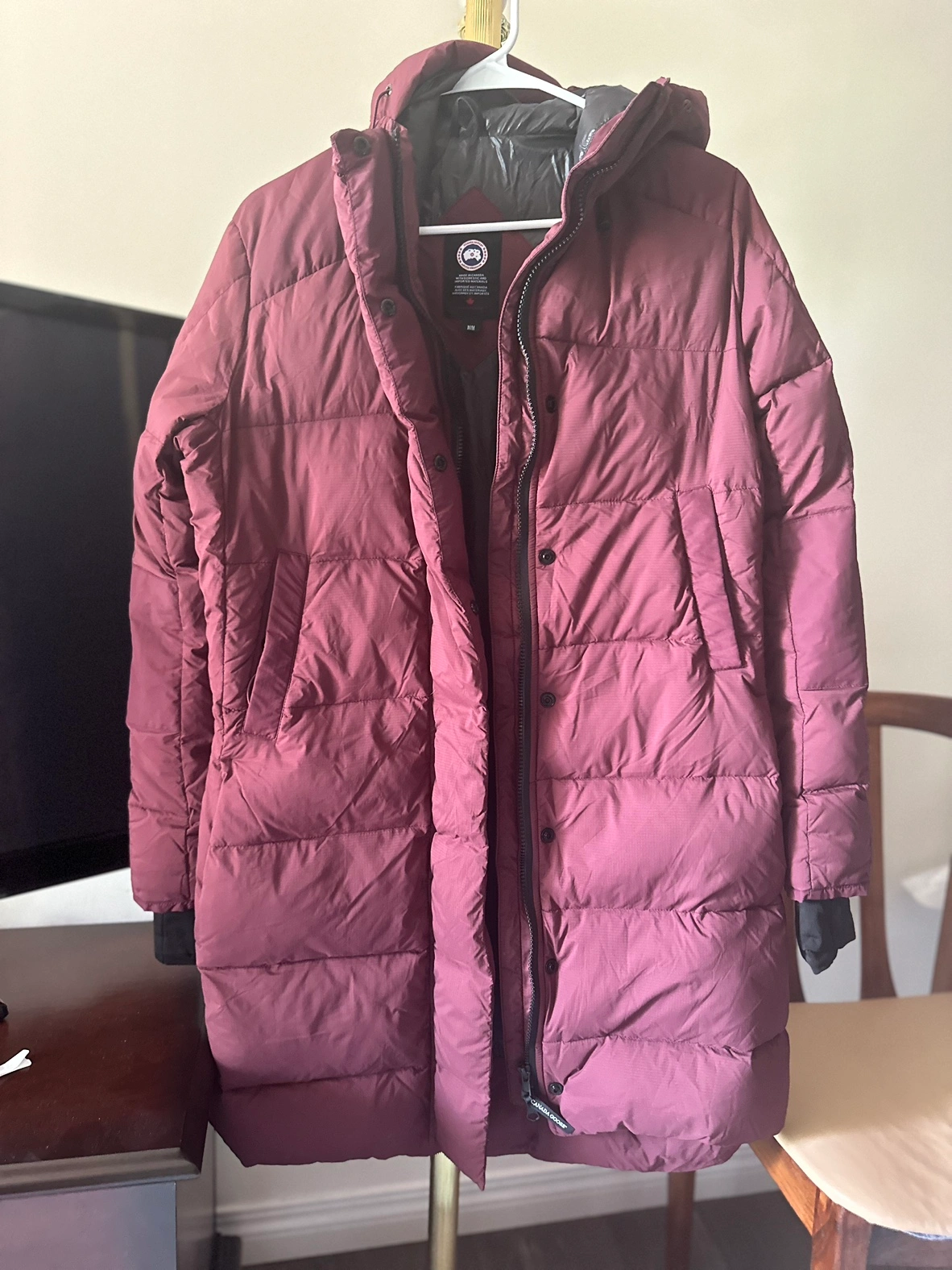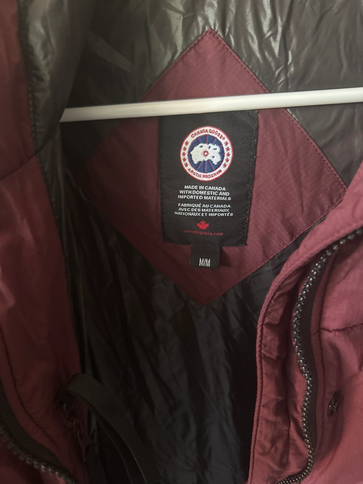Women's Canada Goose jacket in maroon. It has a hood and a zipper closure with a snap button closure. It has a patch with the Canada Goose logo on the left sleeve. It has an inside pocket. Size M Bust: 45" Waist: 42" Shoulder: 17" Length: 39.5" Sleeve: 34.75" 90% Down, 10% Feather