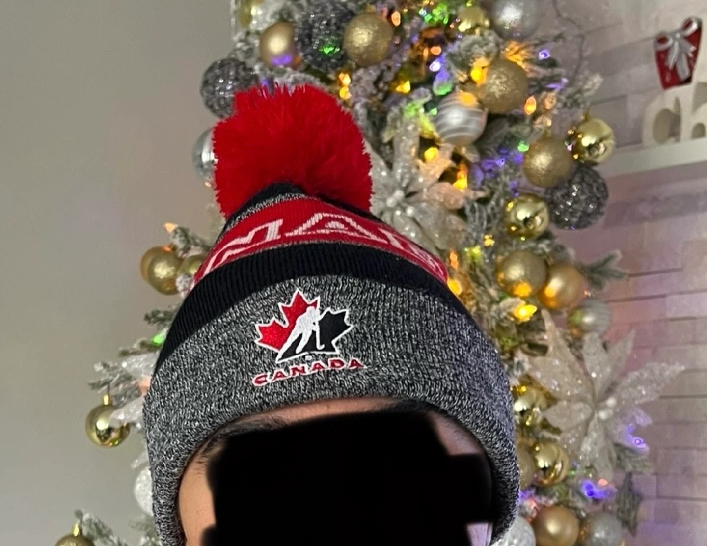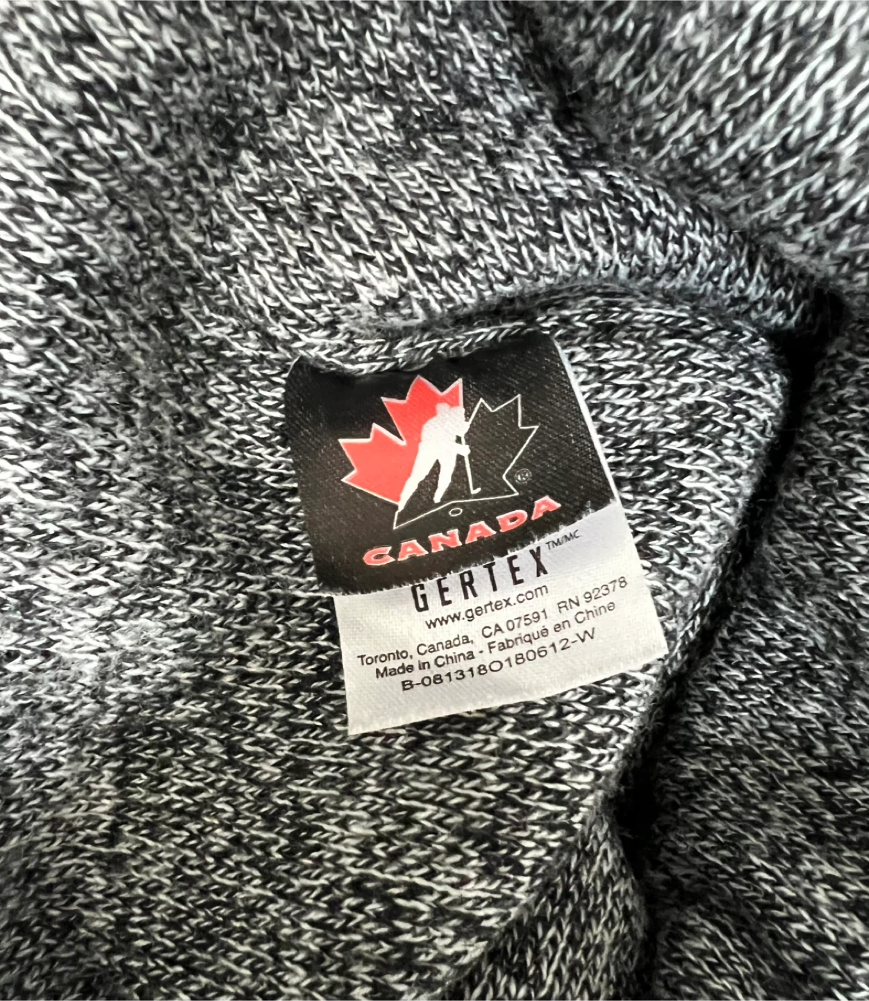 53Cozy Canada toque, perfect for the winter! It features a red pompom, a black and red band with 'CANADA' written across, and a grey bottom with the Canada logo. The brand is Gertex.
